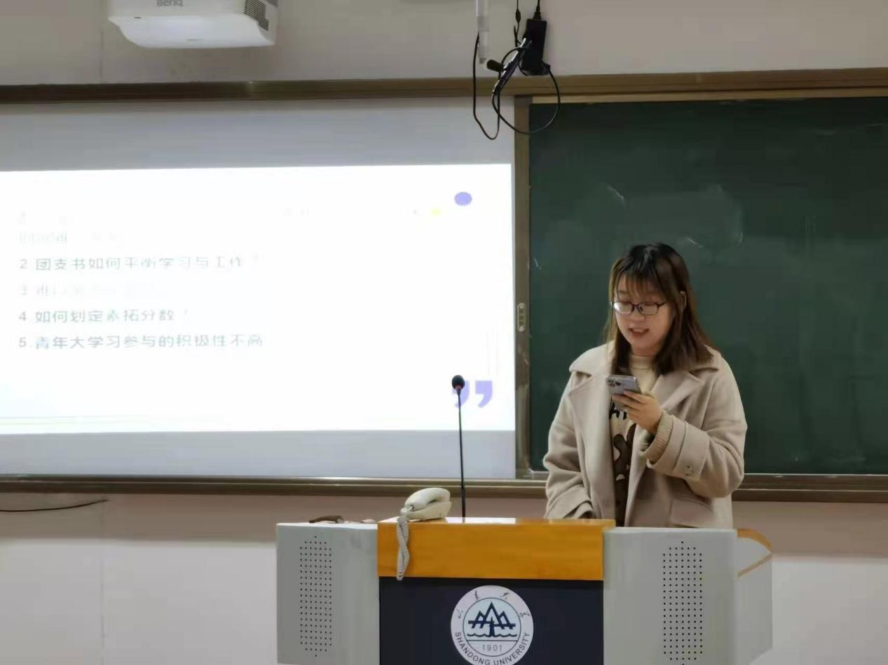 学生会团支部服务中心部长姜天资就团支部建设过程中出现的问题进行了讲解,就与会各团支部委员关心的青年大学习活动开展、提高主题团日活动参与的积极性、如何平衡学习与工作等问题进行了一一解答,并对各团支部委员接下来有序开展团支部工作提出了期待。