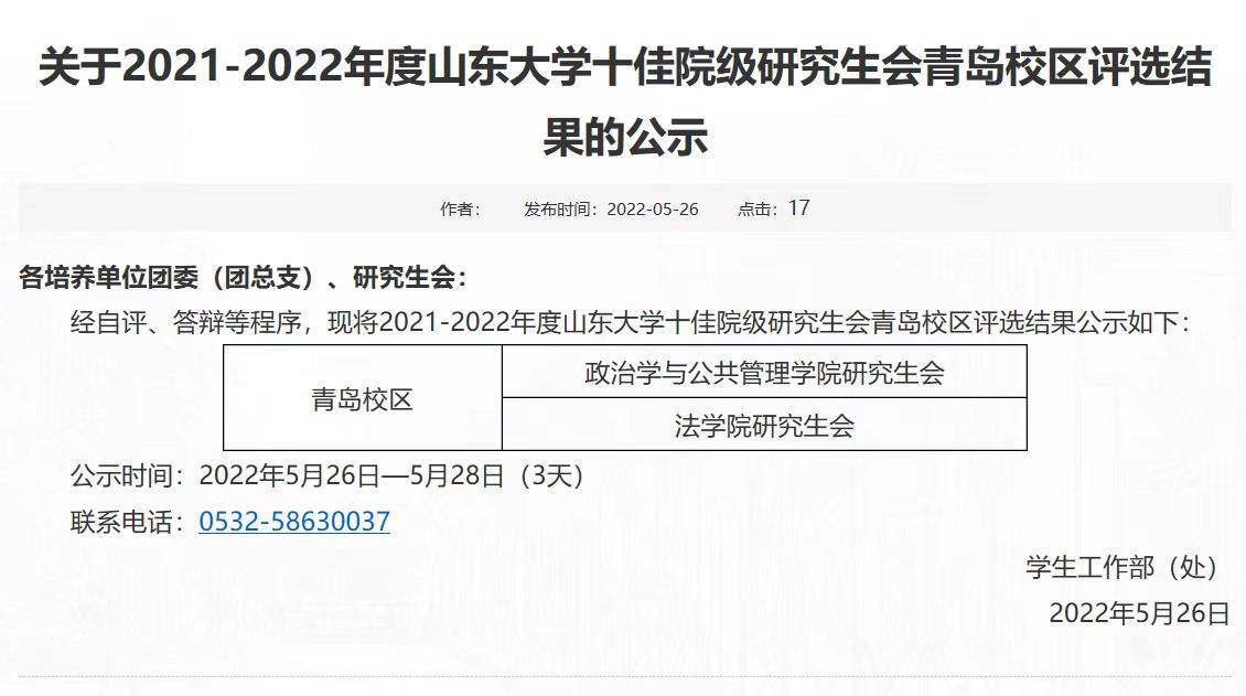 研究生会凭借卓有成效的扎实工作和各部门的通力合作,最终以青岛校区第一名的成绩荣获2021-2022年度“山东大学十佳院级研究生会”荣誉称号。我院研会已连续三年获此殊荣。