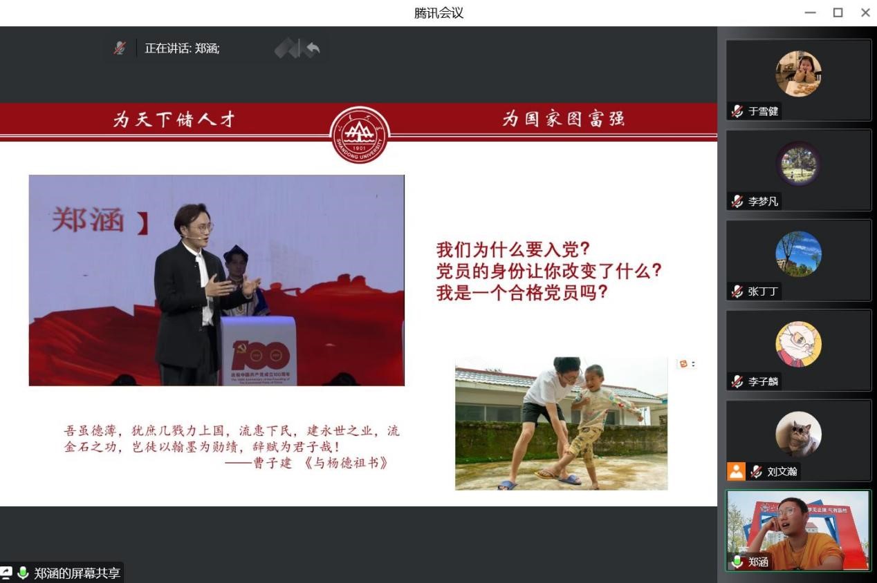 随后,2021年度研究生道德风尚奖学金获得者、山东大学(青岛)团工委兼职团干部郑涵以《不要丢了精神》为主题,从“同志你好”、道德风尚奖获选心得、个人感受三个方面进行了分享,他讲道:“不要丢了精神,做一个合格的山大人,做一个合格的共产党员”。郑涵讲述了参与制作校史话剧《风雷振声》、毕业歌《山海等风》,“挑战杯”项目《寻访青岛红色足迹》等的心得体会,他在不同领域、用不同形式讲述山大故事,传承红色基因,让与会人员感受到了前人风采和山大精神。