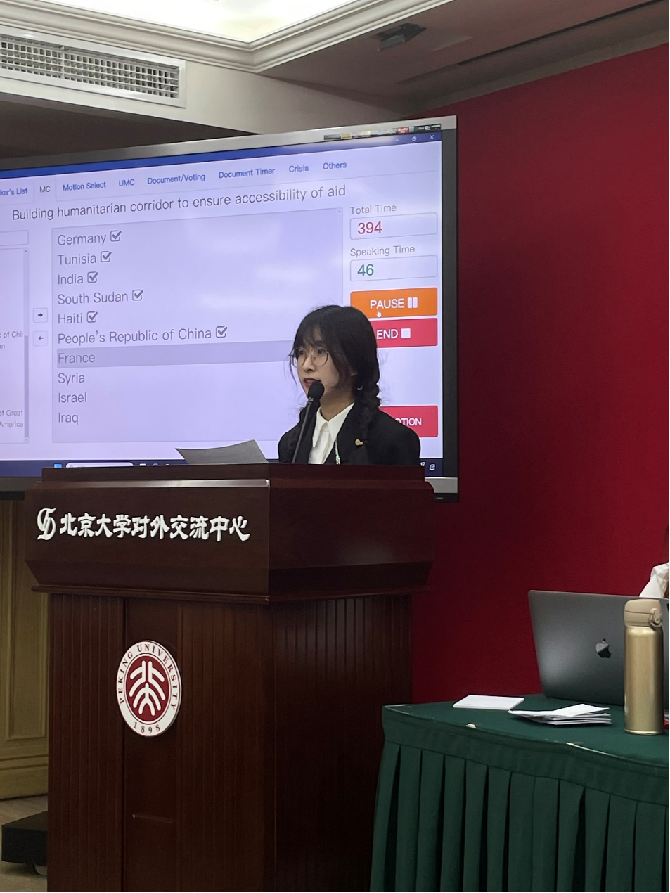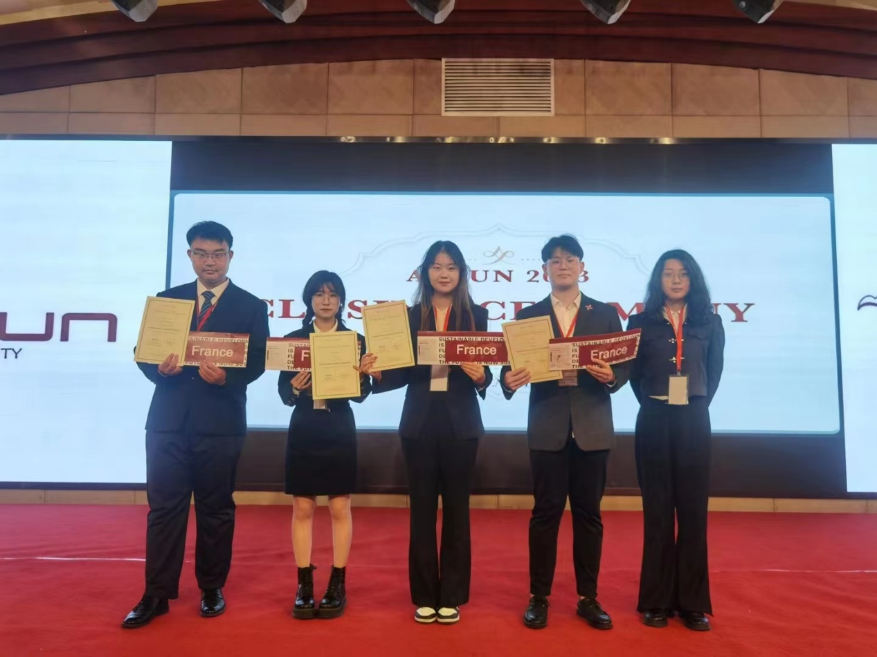 本次亚洲国际模拟联合国大会由北京大学主办,在北京大学线下举行,共设8个分会场。山东大学参会的5位同学分属三个会场,曲子寰和李永昌作为法国代表出席联合国安理会会议,为防止恐怖分子获取大规模杀伤性武器做出杰出贡献;李佳萱和宋若雨作为法国代表出席联合国大会会议,为推进防止饥荒和粮食不安全问题贡献优秀方案;黄琳雅作为阿根廷代表出席联合国人权理事会会议,为流离失所女性的经济安全制定有效措施。