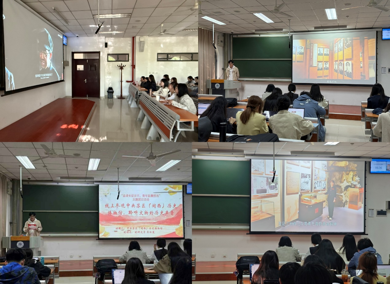 在“共赴光影之约”环节,同学们观看了精心剪辑的电影《血战湘江》片段,影片中红军战士前赴后继、血染湘江的镜头直击人心。随后,活动通过“云端连线”中央苏区(闽西)历史博物馆,由副馆长吴红莲担任“云端讲解员”,以馆藏文物为纽带,讲述红三十四师军旗、烈士遗物背后的故事。“这件布满弹孔的军装,见证了战士们‘为苏维埃流尽最后一滴血’的誓言……”随着镜头聚焦文物细节,历史记忆从文字与影像中“苏醒”,让青年学子在跨时空对话中感受革命先辈的精神温度。