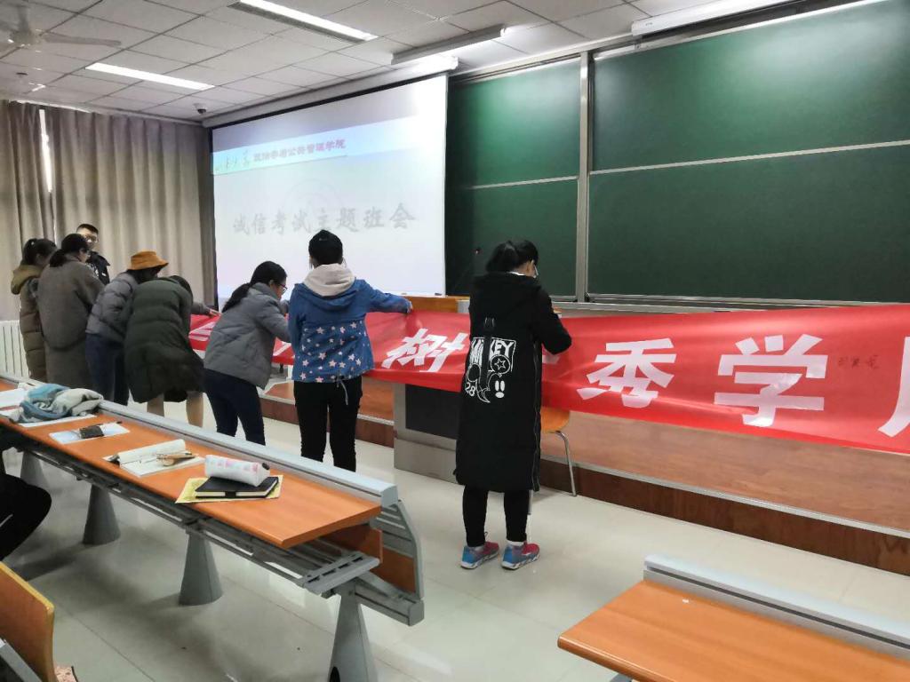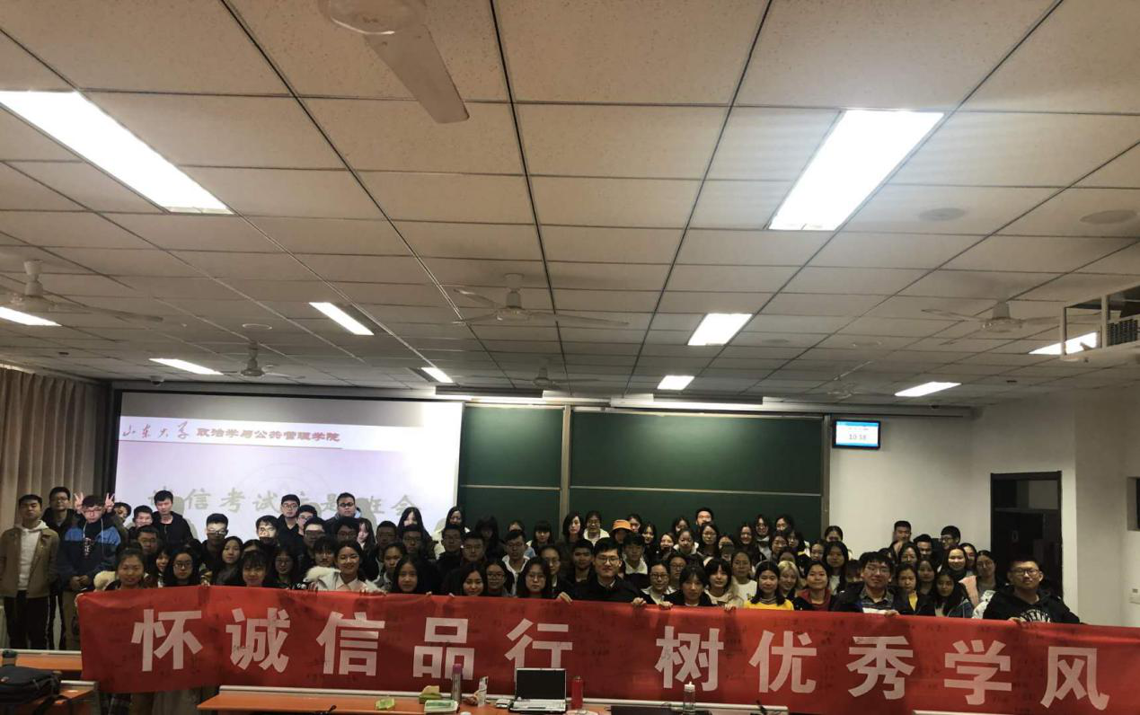 诚信品行是政管学子应该具有的优良品格,优秀学风是2018级本科班应该为之不懈努力的方向。班会最后,政治班和公管班班委组织同学们在“怀诚信品行,树优秀学风”条幅上签名,用以提醒同学自觉遵守考试纪律,端正考试态度,做合格的山大学子。