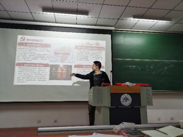 班会第二部分,李澳同学上台为大家讲述了他的家乡——大别山的故事。从那走出来的李澳同学对家乡有着相当深厚的情怀,他声情并茂,为同学们讲述了革命老区70年来在经济、文化、社会等多方面的发展,以及红色记忆在这之中的作用与传承,最后还回答了同学们的疑问,使同学们更加具体地体会到了发展的力量。