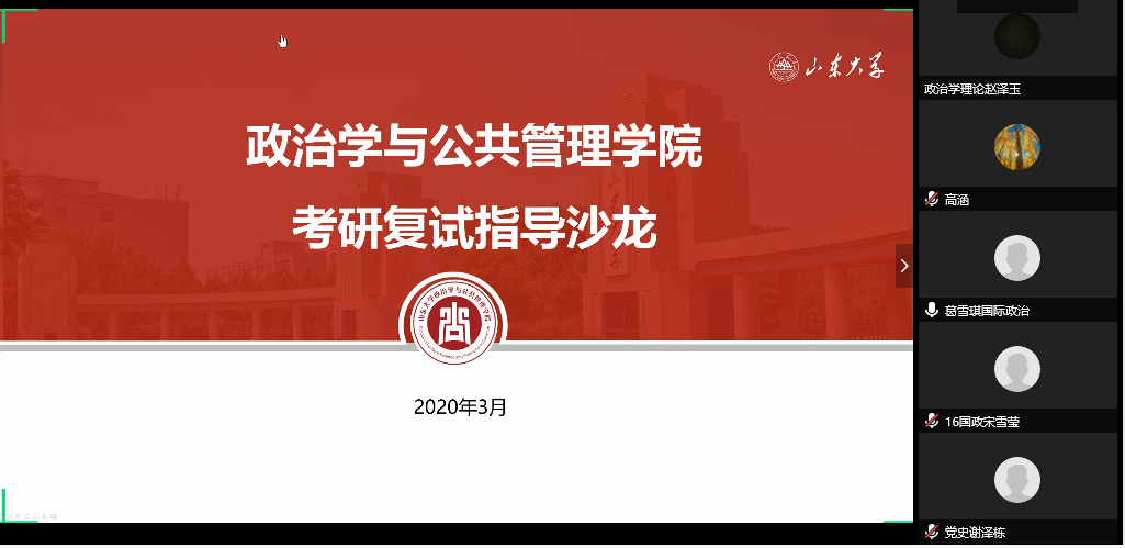 四名研究生代表作为主讲嘉宾,以亲身经历给大家答疑解惑。高涵同学对行管专业复试的签到、笔试、面试三个环节进行了系统的介绍,帮助同学们了解复试的基本步骤。李钦同学则从复试细节出发,对自我介绍、简历准备等问题进行说明,提醒大家不忘关注时事要闻。此外,他还强调复试要保持良好的心态,提升面试中过程中的应变能力。跨考复旦大学法学专业的荣周继萱同学就跨学校、跨专业考研提供建议,他认为需要通过多渠道了解报考学校的面试结构和往年真题,注意思考报考专业与本科所学专业的联系,并强调了英语能力的重要性。张明同学重点分享了本校政治学理论笔试的参考书目,为同学们介绍了考试题型、做题技巧,提醒大家要注意答题的广度和深度。互动环节同学们积极踊跃,就联系导师注意事项、面试技巧等问题进行了提问,主讲嘉宾一一解答,并给出针对性建议。