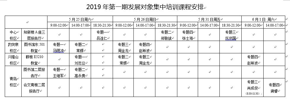 学校在中心校区、趵突泉校区、兴隆山校区以及青岛校区设4个班次,学员以“就近就便”为原则,在对应班次按照课程安排参加集中培训,课程安排如下:
