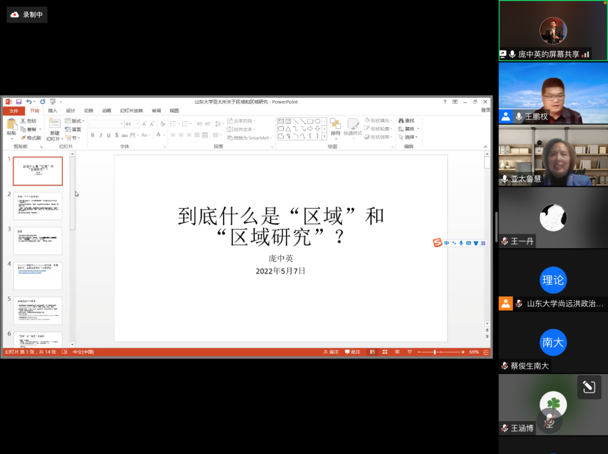 、亚太研究所联合主办,亚太研究所大国关系与地区安全研究中心承办的“社科与人文”系列讲座第十一讲在线上顺利举办,讲座题目为“到底什么是‘区域’和‘区域研究’”。本次讲座由中国海洋大学特聘教授、海洋发展研究院院长庞中英主讲,主持人为亚太研究所大国关系与地区安全研究中心主任王鹏权博士,亚太研究所副所长赵玙佳副教授、亚太研究所地区环境与中国周边外交研究中心主任李昕蕾教授担任与谈人。