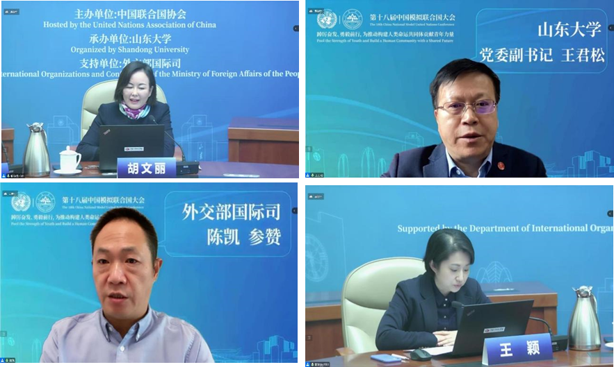 开幕式上,胡文丽副会长兼总干事在致辞中表示,中国模拟联合国大会是青年认识和体验联合国等国际组织的实践平台,希望大家树立责任意识,培养天下胸怀;了解各国立场,把握谈判技巧;熟悉议事规则,积极参与讨论,大家要牢记习近平总书记的殷切期望,把握中国式现代化发展的时代机遇,为实现中华民族伟大复兴、构建人类命运共同体作出应有贡献。王君松副书记表示,山东大学非常荣幸承办第十八届中国模拟联合国大会,并将承办此次会议作为学校进一步推进国际组织后备人才培养和推送工作的重要契机,希望同学们立大志、明大德、担大任,与祖国同心、与世界同行、与时代同频,努力成为堪当民族复兴重任的时代新人。陈凯参赞表示,中国模拟联合国大会是国内莘莘学子了解联合国、认识多边外交的重要窗口,希望同学们珍惜此次难得机遇,讨论学习国际问题,增长见识才干,提升专业素养、外语水平和综合能力,为成为多边外交事业需要的复合型人才打下坚实基础,并在每个人的成长历程中写下精彩的青春篇章。