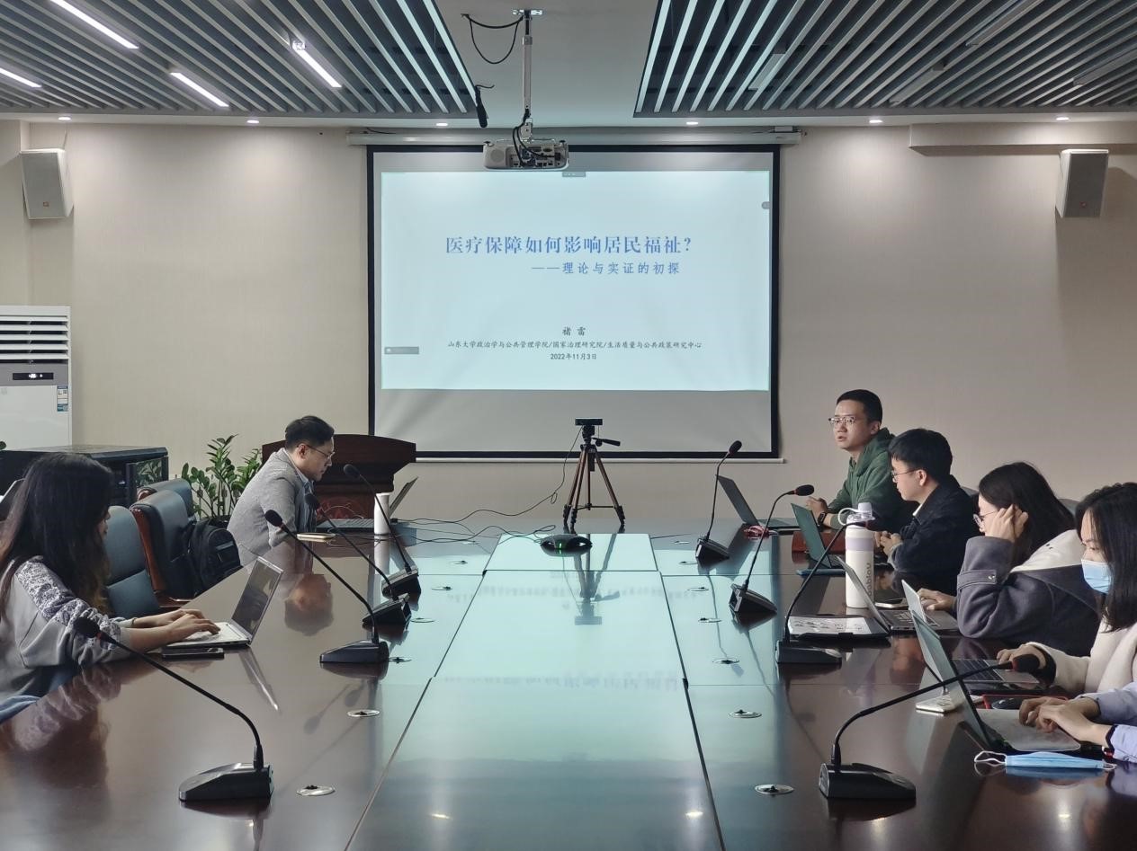 讲座伊始,褚雷老师对基本医疗保险的地位与现状进行了介绍,指出当前我国已建立起世界上最大的基本医疗保障体系,考察评估医保的实施效果也成为各界的关注焦点。褚雷从生活质量理论出发,借鉴可行能力理论的分析框架,通过考察验证功能性活动的中介效应构建得出基本医疗保险幸福效应机制模型。利用山东省居民生活状况实地调查数据进行研究设计,采用结构方程模型对基本医疗保险对居民幸福感的影响及作用机制进行了实证分析。根据研究结果,进一步提出相应政策启示,并做出针对党的二十大报告进行研究的后续展望。