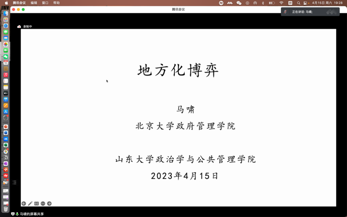 马啸教授以研究问题的缘起为切入点,讲述了其在日本留学期间成为一名“铁路迷”,而后在博士论文撰写期间对“高铁建设过程中为什么会存在时间与空间差异?这个差异是否为政治因素?”等问题产生了研究兴趣,通过提出地方化博弈的概念弥补了恩庇侍从、技术官僚等既有解释的不足,为理解分配政治构建了新逻辑。随后,马啸教授详细讲解了地方化博弈的含义、出现原因、如何博弈、影响因素和理论内涵这五个方面内容。