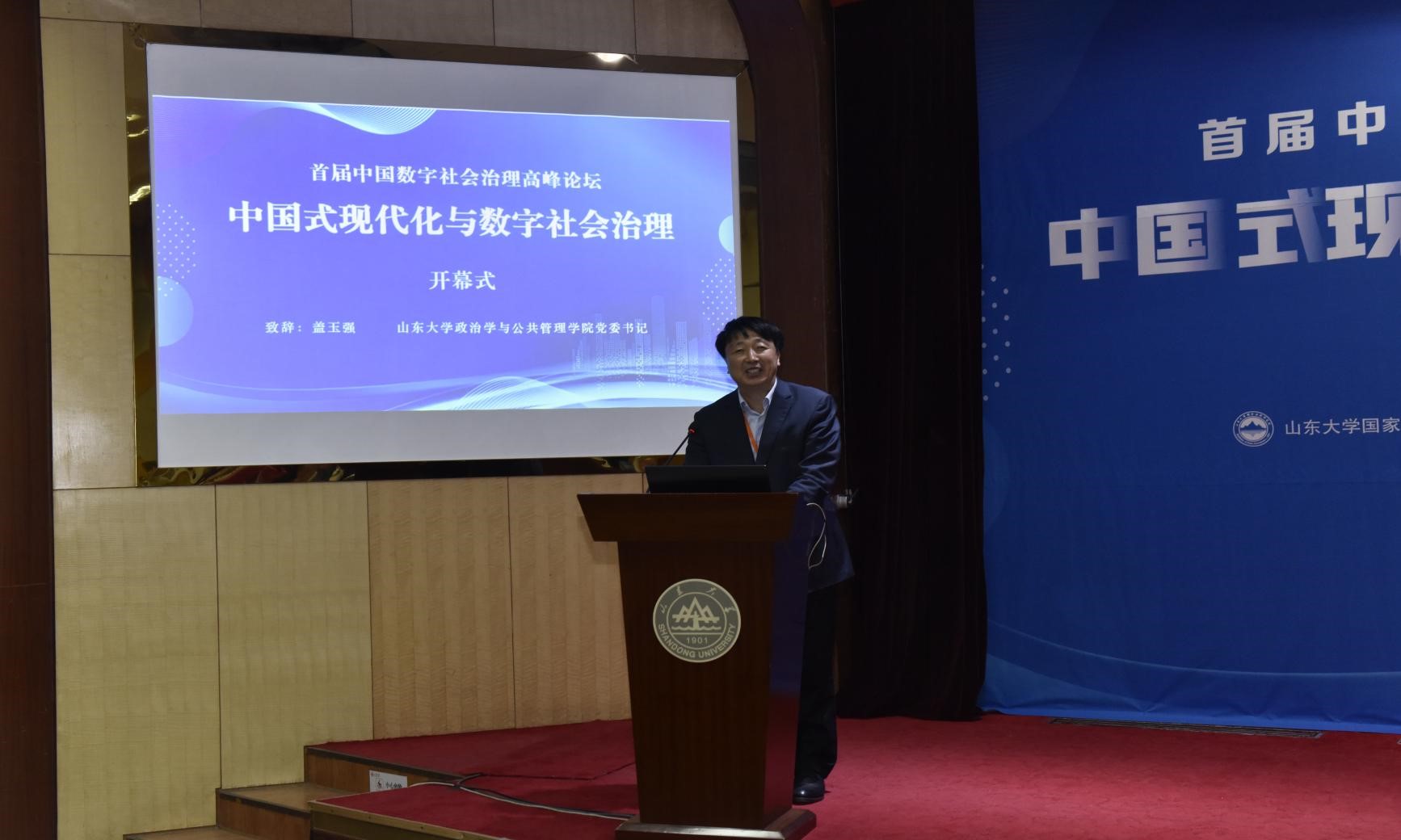 党委书记盖玉强出席开幕式并致辞。曹现强简要介绍了山东大学的学术发展概况和国家治理研究院基本情况,指出作为数字中国战略的重要组成部分,数字社会战略的贯彻落实至关重要,对社会效能的提升有重大影响。为进一步提升数字社会治理能力和水平,充分发挥数字技术在社会治理中的关键作用,亟需学界、政府部门、产业部门的共同努力,这也是本次论坛举办的初心。