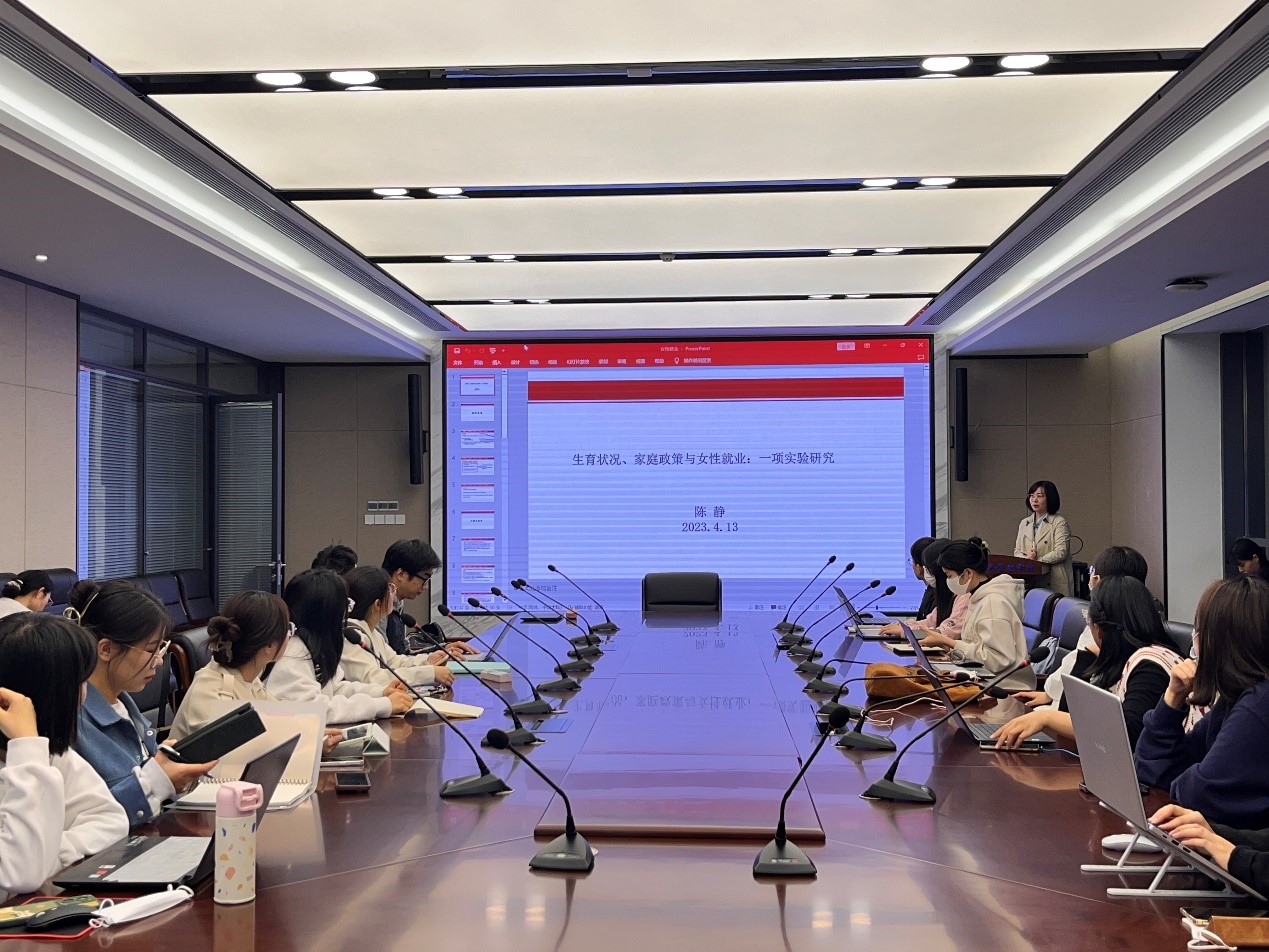 师生分享了其聚焦生育状况和家庭政策对不同生育状况的女性就业机会的影响所开展的一项实地实验研究。陈静指出,面对国家生育政策的变化、各省市不同程度延长女性产假时长、女性劳动参与率持续下降的现实背景,学界缺乏对基于女性生育状况的就业机会歧视的实证研究,家庭政策对不同生育状况女性就业的影响也尚未可知。陈静详细阐述了其基于既有文献提出研究假设、设计并实施实验的研究过程,并汇报展示了相应的研究结果、政策建议等内容。该研究拓展了既有文献的研究维度,为理解福利国家悖论提供了新的微观视角,令与会师生收获颇丰。