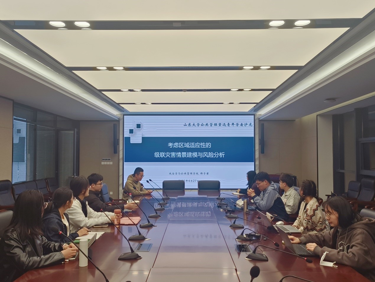 2023年4月27日,由公共管理系主办的“考虑区域适应性的级联灾害情景建模与风险分析”讲座于华岗苑五楼报告厅顺利举办。讲座由山东大学副研究员郄子君主讲,副研究员程龙主持,吸引了众多师生参加。