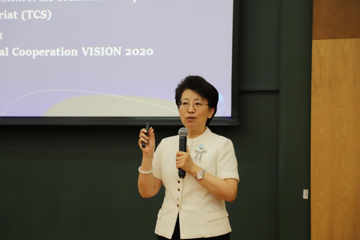 欧渤芊从外交会议与合作组织机制的实际情况出发讲述中日韩合作机制化的开端、中日韩合作秘书处的机构设立、中日韩合作的内生动力以及新形势下面临的外部挑战,重点提出新形势下的中日韩合作外部环境“新”在何处。她详细介绍了中日韩合作秘书处与山东大学签署的“东亚文化之都”活动、青年大使、青年峰会、实践实习等合作项目。最后,她指出新形势下越是困难越需要推动中日韩合作发展,为维护地区稳定与经济复苏贡献力量。
