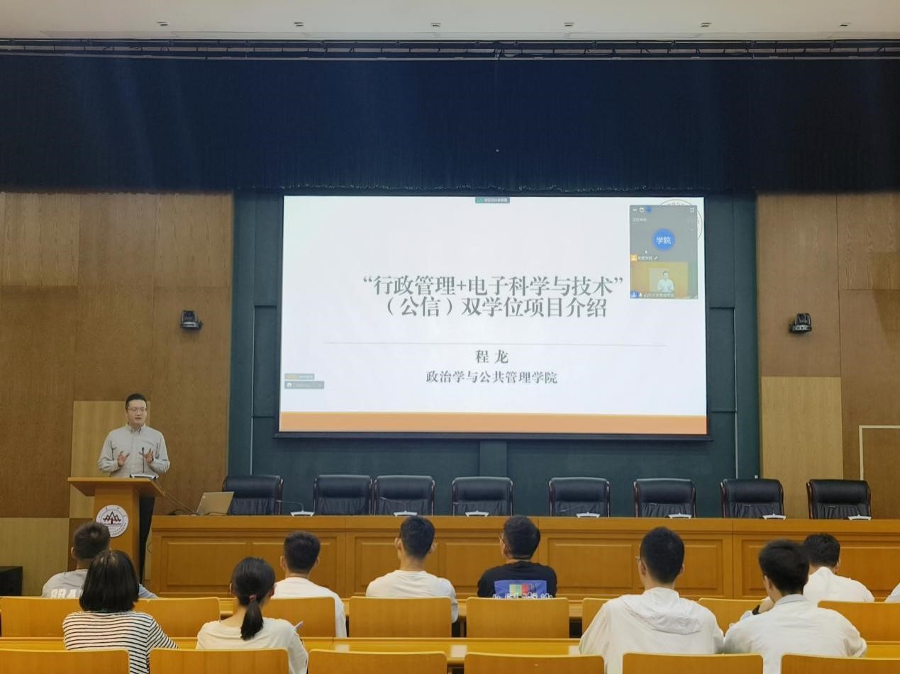 讲座伊始,程龙老师对“行政管理+电子科学与技术双学位”进行全面讲解,细致梳理其专业基本信息、设置背景、专业定位、培养特色、核心课程、就业面向及人才培养现状。紧接着,栗华老师从“文工”专业交叉方向出发,介绍专业设置目的、课程安排思路、实训课程的实践意义等,深入讲解公信双学位培养方案及教学计划,在强调其“小班制教学”的培养特色的同时分析了公信班未来升学及就业方向。随后,公信班2021级郭瀚泽、2022级时继伟两位同学作为学生代表就自身学习生活感受及专业个性化培养模式进行了分享。