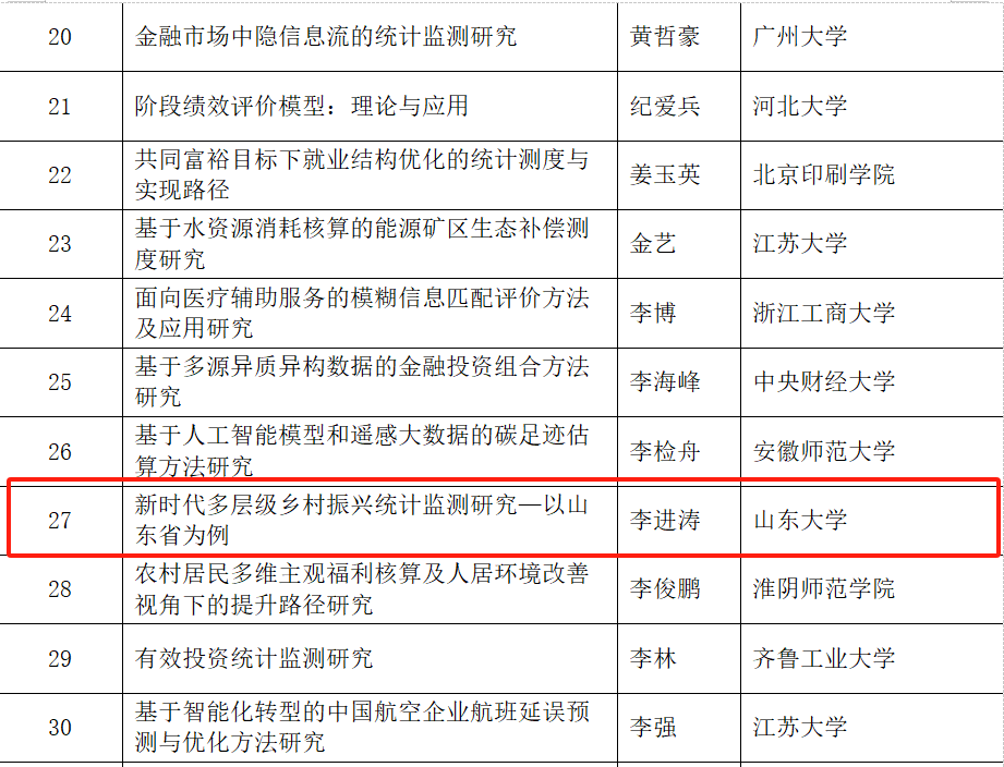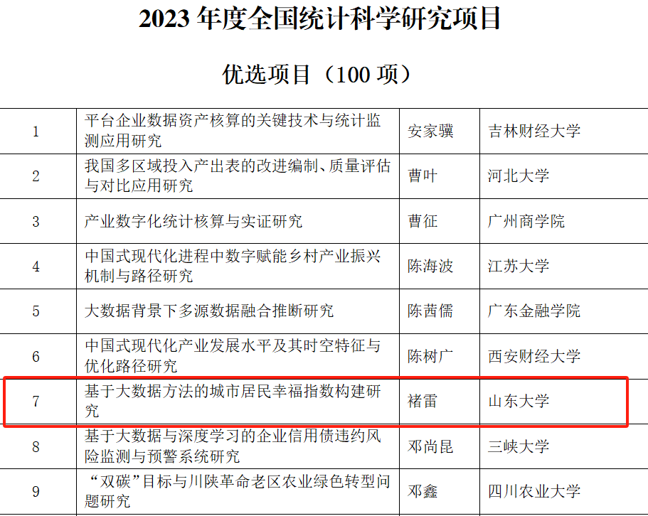 日前,全国统计科学研究组织管理办公室公布了2023年度全国统计科学研究项目立项名单。山东大学生活质量与公共政策研究中心副主任、专任研究员李进涛的《新时代多层级乡村振兴统计监测研究—以山东省为例》、中心专任研究员褚雷的《基于大数据方法的城市居民幸福指数构建研究》获批优选项目。此次全国统计科学研究立项充分彰显了中心服务地方与决策支持的新型智库作用。