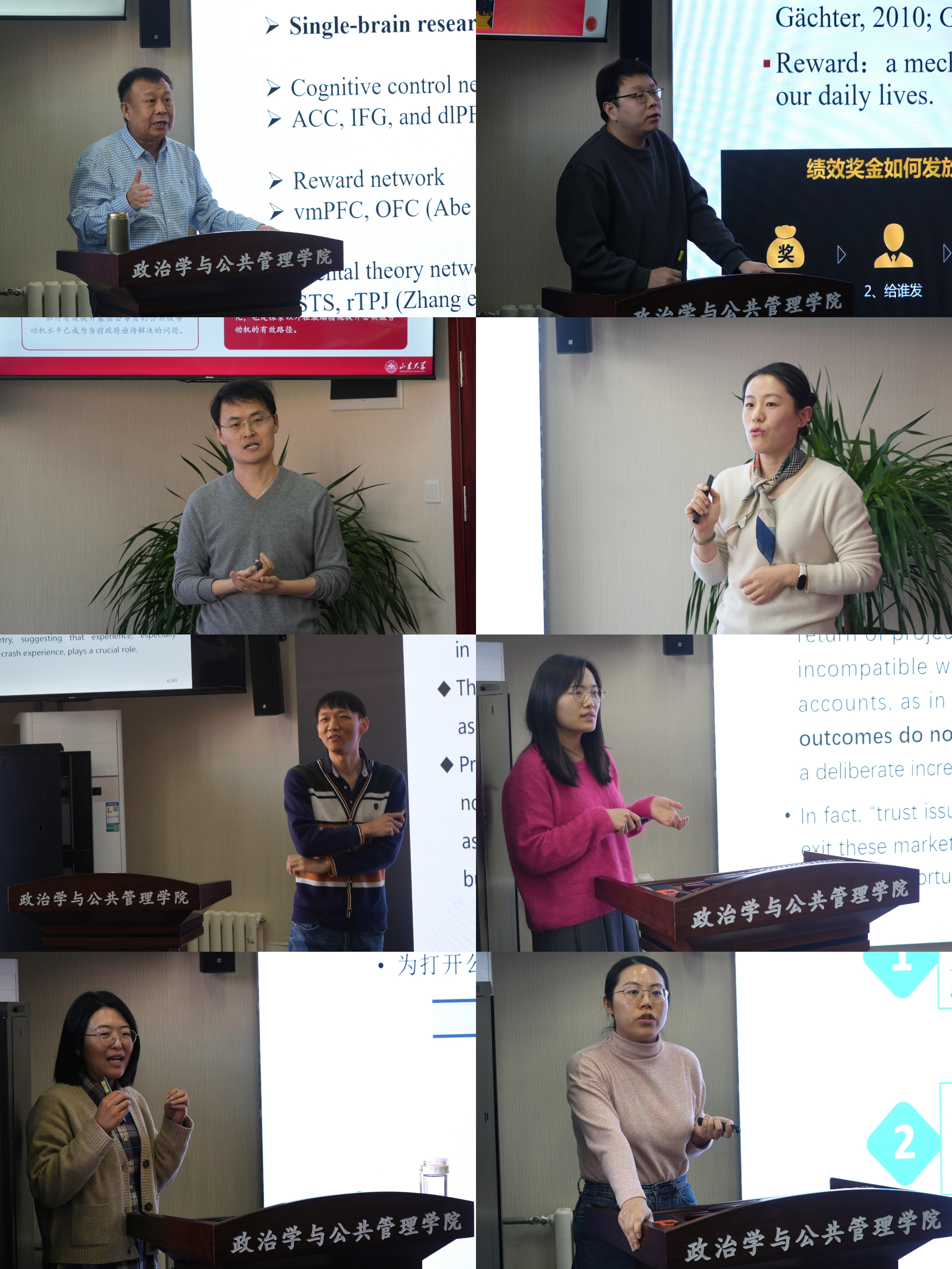 副研究员牛晓飞做了题为Pro-cyclical Learning Asymmetry: Evidence from Financial Professionals的报告,分析了投资者在股票市场牛熊经济周期中学习和信念的不对称性,揭示了泡沫破灭经验在金融市场投资中的重要作用。公共治理研究院助理教授王乙杰做了题为《行为公共管理与实验室建设》的报告,从研究框架、研究方法和研究探索三方面介绍了行为公共管理的主要内容和发展趋势。