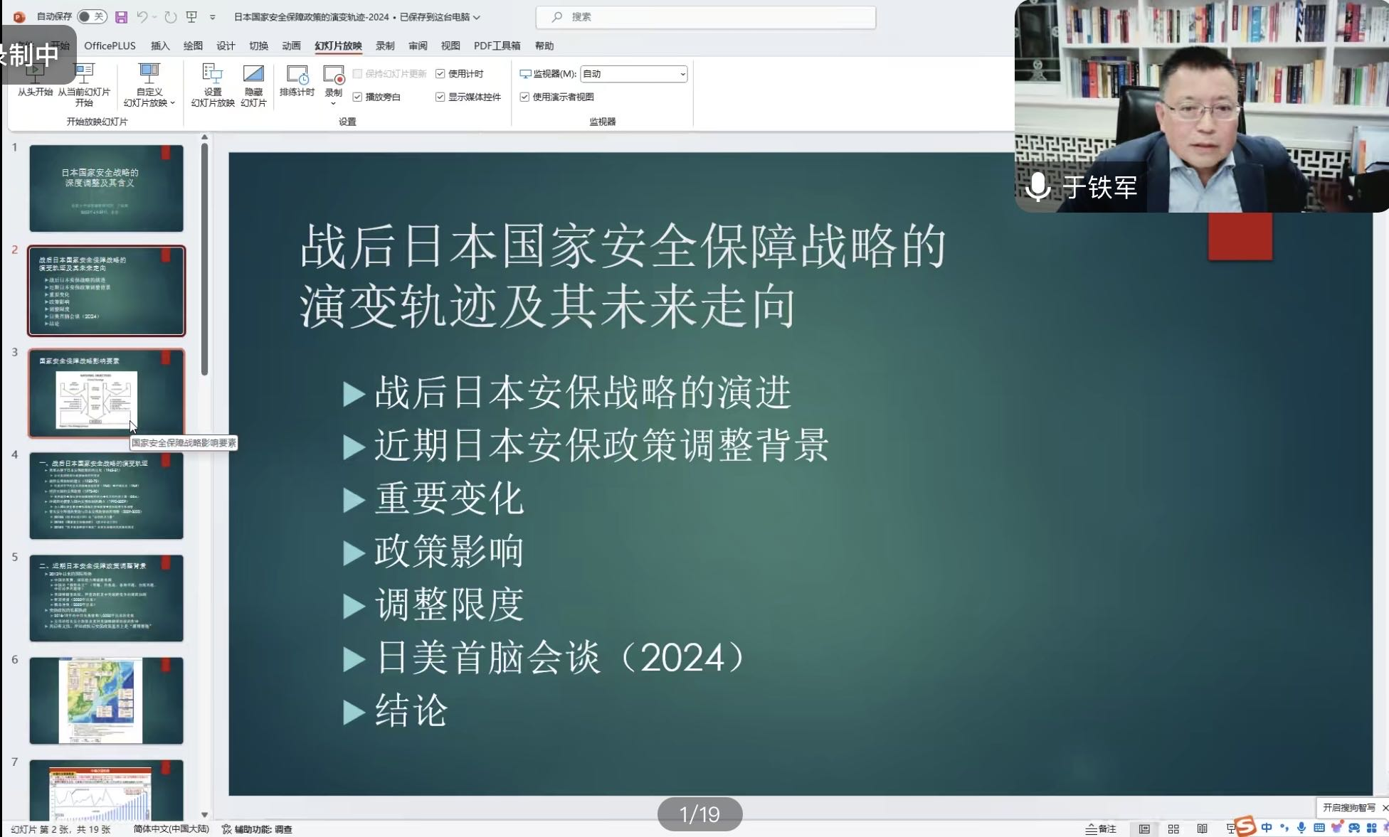 、山东大学亚太研究所联合主办,山东大学亚太研究所大国关系与地区安全研究中心承办的“社科与人文”系列讲座第二十五讲在线上顺利举办,讲座题目为“战后日本安全保障战略的演变轨迹及未来走向”,由北京大学国际战略研究院院长于铁军教授主讲。亚太研究所大国关系与地区安全研究中心主任王鹏权副教授主持学术讲座。亚太研究所所长杨鲁慧教授致辞,并简要介绍了亚太研究所和“社科与人文”系列学术讲座的基本概况。亚太所副所长赵玙佳副教授、亚太所地区环境与中国周边外交研究中心主任李昕蕾教授担任评议人。