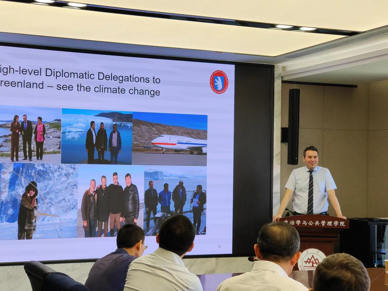 讲座伊始,Jacob Isbosethsen介绍了格陵兰岛作为世界上最大的岛屿的基本情况。接着,他对格陵兰岛的文化与人口、外交政策、经济发展状况、旅游状况等情况进行了详细的介绍,为在场师生更深入地了解格陵兰岛提供了全面的视角。在此基础上,他也重点阐述了气候变化对格陵兰岛来说是个机遇的观点,这为我们关于气候变化产生影响的认知提供了一个新的视角。同时Jacob Isbosethsen对中格合作以及合作过程中青岛发挥的独特作用进行了介绍。呼应Jacob Isbosethsen精彩的演讲,盛力教授认为,尽管中格相隔很远,国际局势风云变化,但双方仍可以齐心协力、相互理解,进一步加强合作交流。