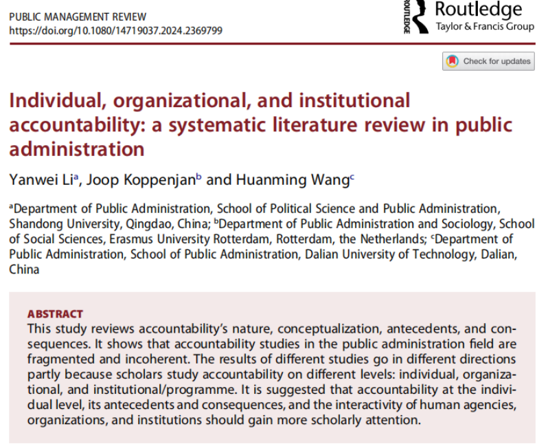 李延伟教授在公共管理顶级期刊Public Management Review (PMR) 发表题为《Individual, organizational, and institutional accountability: a systematic literature review in public administration》的学术论文。