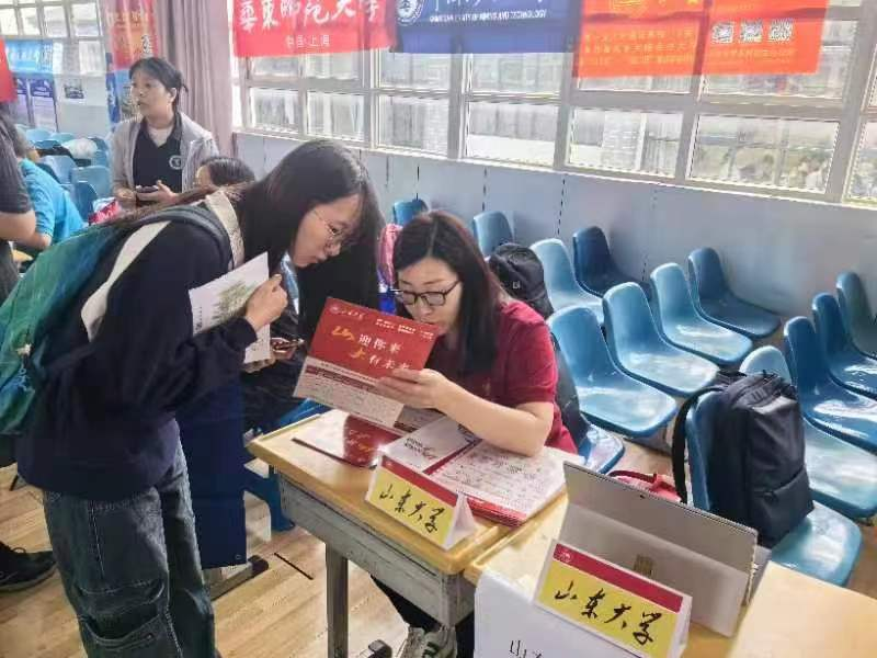 在济南、枣庄、青岛的高招会现场,老师们耐心解答考生关于报考位次、培养特色、师资队伍、就业去向、保研要求、特色班选拔和转专业、校园生活等方面的问题,并对前来咨询的考生及家长详细介绍了相关专业及选科要求,进一步让考生了解山东大学,增进报考信心。
