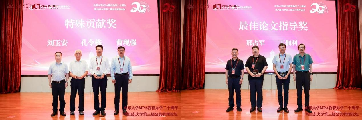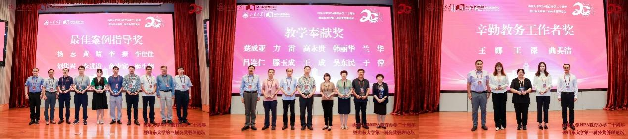 为表彰在山东大学MPA教育事业中做出突出贡献的教育工作者,大会举行隆重的颁奖仪式。刘玉安教授、孔令栋教授、曹现强教授荣获“特殊贡献奖”,楚成亚、方雷、高永贵等教师获得“教学奉献奖”,杨志、黄晴、李振等教师获得“最佳案例指导奖”,王娜、王深、曲美洁等教师获得“辛勤教务工作者奖”,樊丽明等领导嘉宾为各位老师颁发奖牌。