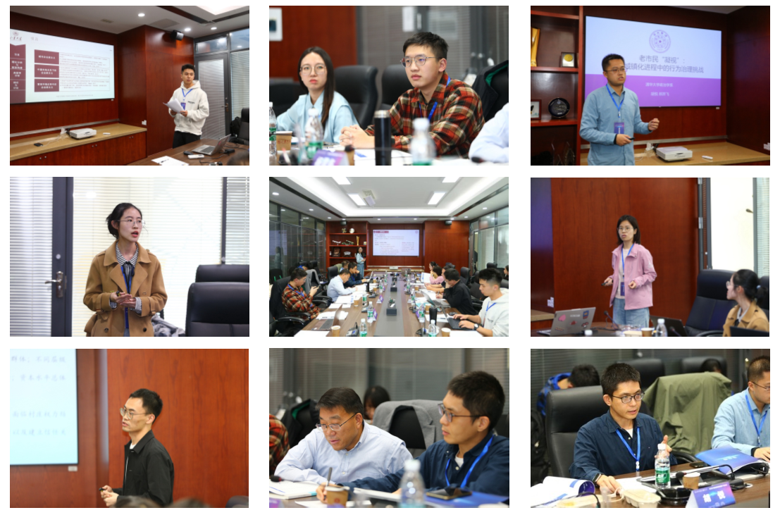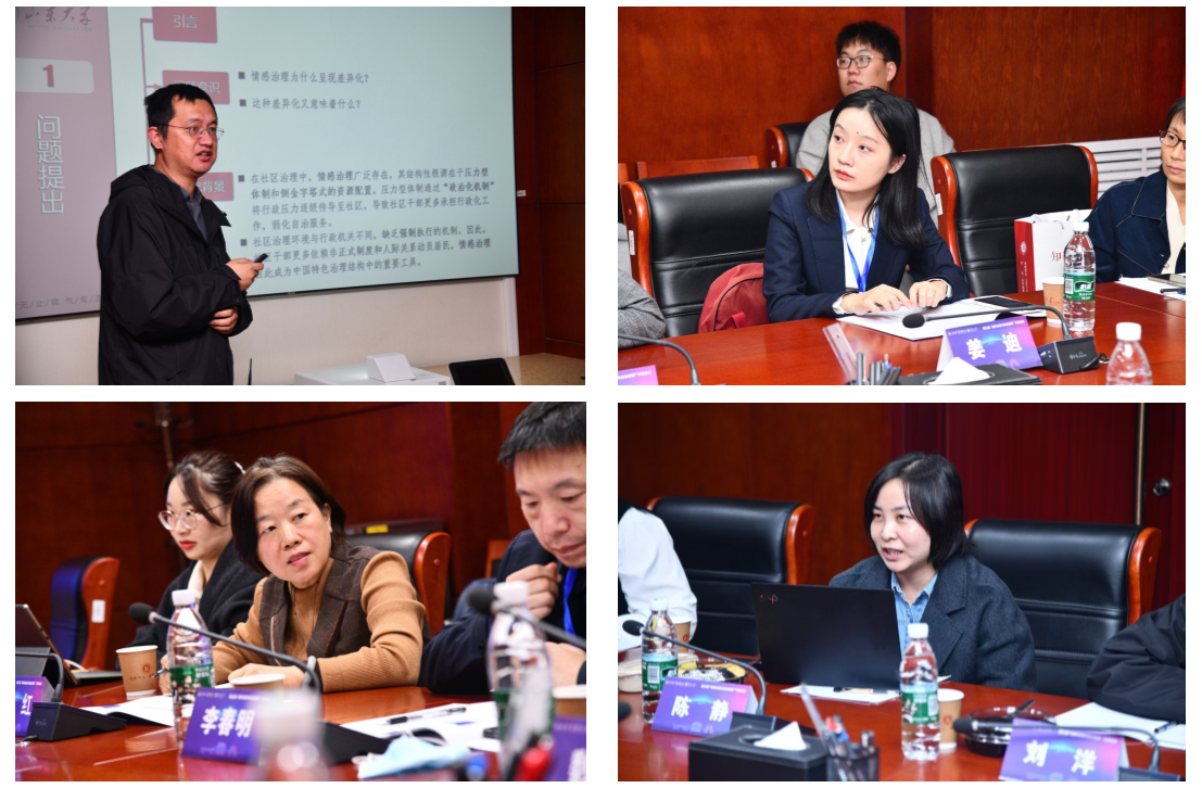 学报》副主编栾晓峰担任主持人。山东大学博士研究生叶沐青分享了企业家主义治理逻辑在营商环境改革中影响地方实践行动的机制;清华大学杨雪冬教授、清华大学硕士研究生胡天宇报告了有关决策者视角下城市工作重心转变的研究;清华大学胡悦副教授、清华大学博士研究生邢羿飞运用主观社会比较实验的方法,研究了新老市民身份在交往中的关系以及对社会治理的影响;南开大学博士研究生康炯慧通过分析G省的实践阐释了公共服务共同生产向价值共创的转化所需的三个递进阶段以及公共服务价值共创的驱动机制。中共山东省委党校张文翠老师、华南师范大学刘洋副教授肯定了上述选题的现实性,并就如何进一步完善研究进行了交流。中共山东省委党校张文翠老师讨论了地方政府在落实乡村振兴政策时,如何寻求上级指令贯彻与基层自主之间的平衡;南开大学博士研究生李宁卉对吹哨报道的现实表现与困境进行了深入讨论;华南师范大学刘洋副教授提出干部下沉的赋能过程主要在于组织建设、资源转化与政策执行。清华大学杨雪冬教授和胡悦副教授指出了现有研究的优缺点与完善方向。