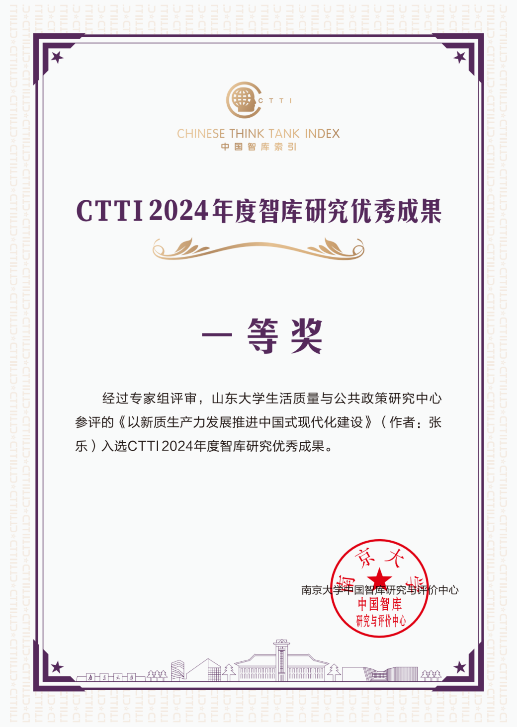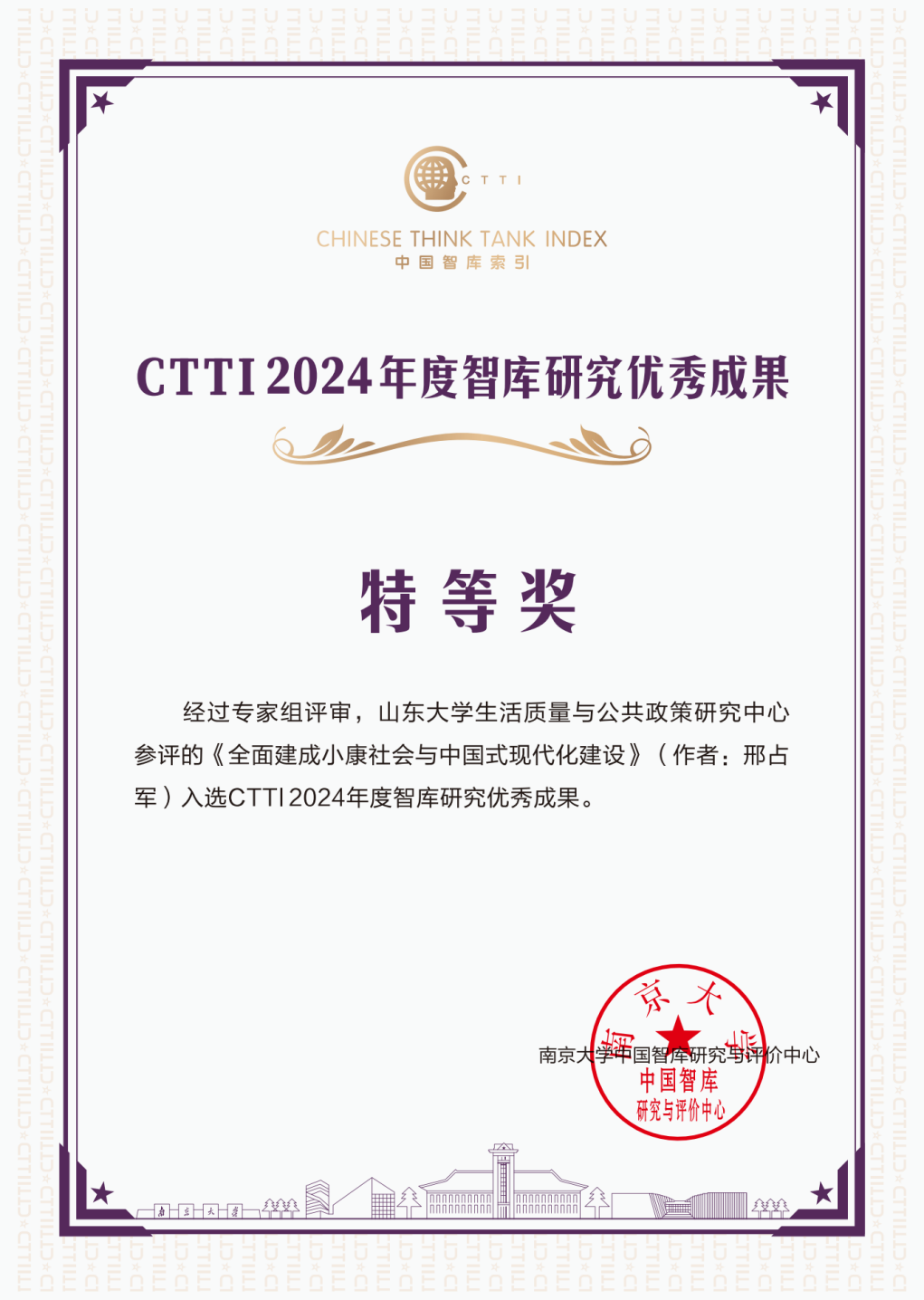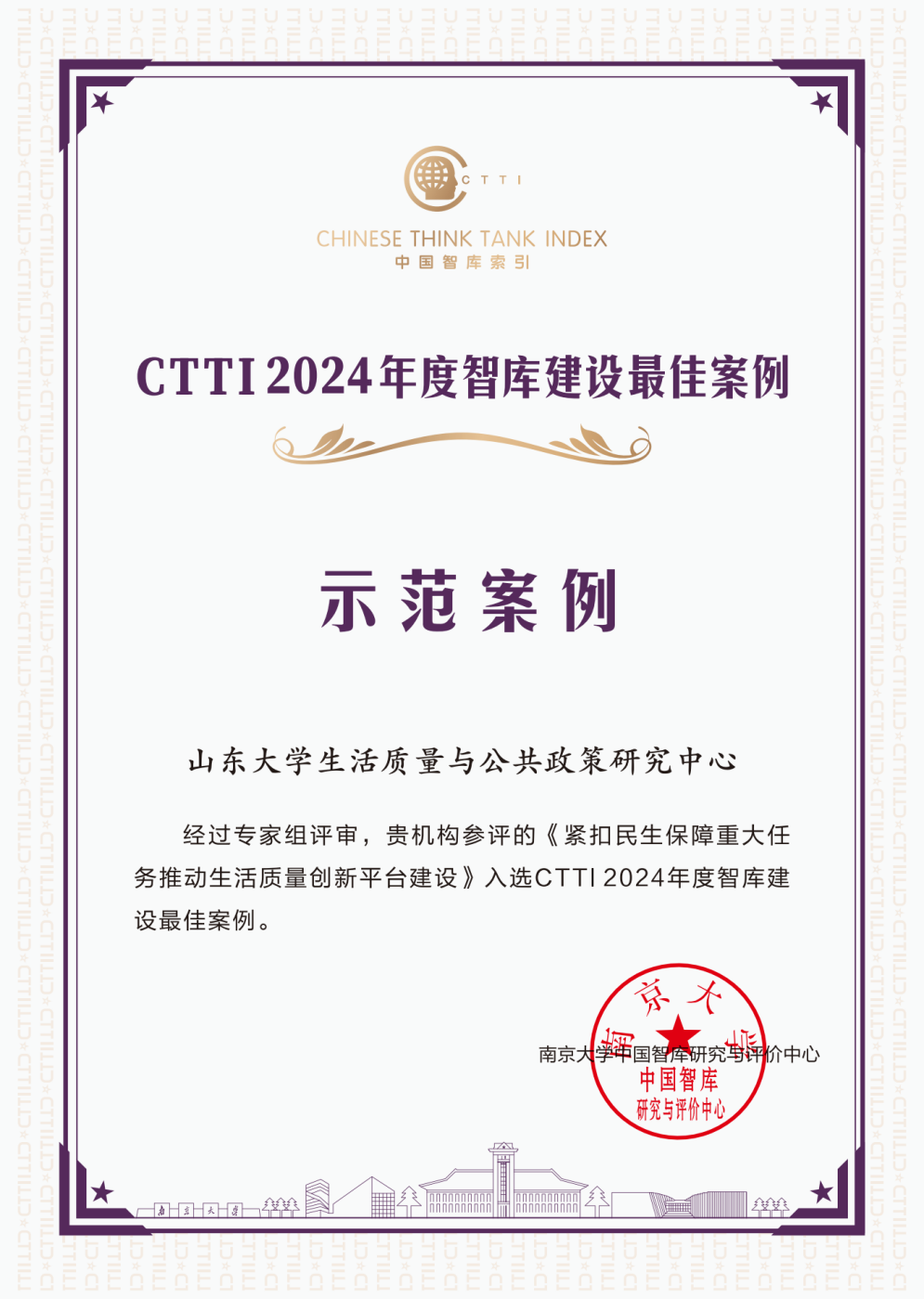 “中国智库索引”(CTTI)是南京大学中国智库研究与评价中心和光明日报智库研究与发布中心合作开发的智库数据管理与评价系统,其权威性和客观性已经得到业界的广泛认可。山东大学生活质量与公共政策研究中心于2022年入选中国智库索引(CTTI)来源智库,并有多项成果荣获优秀成果奖。