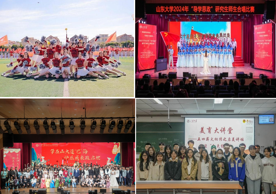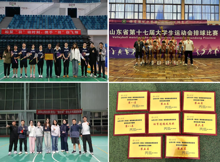 获山大“导学思政”研究生师生羽毛球赛青岛赛区赛冠军,思壮杯羽毛球比赛亚军,研究生篮球赛亚军,“山大杯”系列球赛乒乓球女团冠军、女篮联赛季军、足球赛亚军、网球赛双打亚军,导学思政奖等好成绩。足球比分90