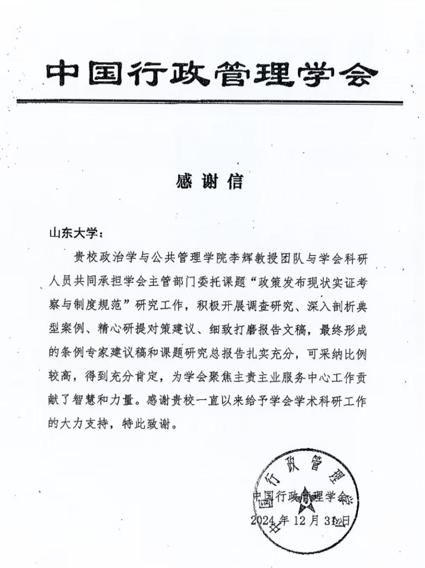 李辉教授团队与中国行政管理学会科研人员通力合作,共同承担了学会主管部门委托的“政策发布现状实证考察与制度规范”课题研究。在研究过程中,李辉教授带领团队积极开展实地调研,深入剖析典型案例,并在此基础上精心研提对策建议。最终形成的条例专家建议稿和课题研究总报告内容扎实、论证充分,受到学会主管部门的充分肯定,也得到学会领导及同行的高度赞扬。