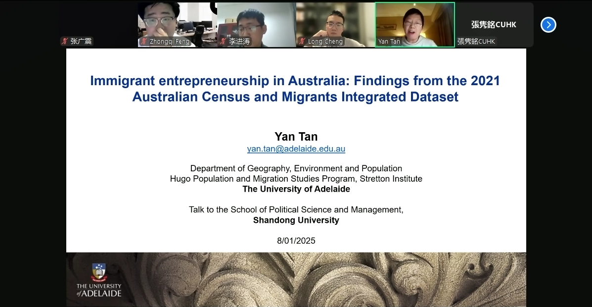 和山东大学生活质量与公共政策研究中心主办的“敏政·厚生”系列专家讲坛第七期于线上举办。本次讲座主题为“Immigrant entrepreneurship in Australia: Findings from the 2021 Australian Census and Migrants Integrated Dataset”,由阿德莱德大学地理、环境与人口系副教授、斯特雷顿研究所雨果人口与移民项目负责人谭燕主讲,山东大学生活质量与公共政策研究中心副主任、足球比分90