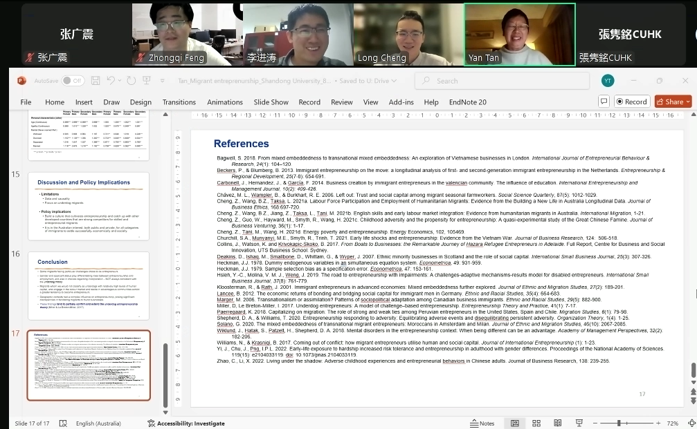 谭燕教授首先就澳大利亚移民的整体状况进行了简要介绍,接下来深入剖析了研究关键问题与理论架构,依据弱势群体创业理论梳理出移民身份、地理区位、人力资本、社会资本及个体特质五类关键要素。最后,借实例呈现各类因素对移民创业决策的作用效果。谭燕教授指出,在全球格局动态变迁的当下,澳洲移民相关课题亟待深入钻研,务必重视理论与实证融合、数据深度剖析及方法恰当运用,助力该领域学术探索持续前行。
