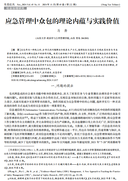 近日,山东大学智慧国家治理实验室执行主任马奔教授在《东岳论丛》期刊上发表了题为“应急管理中众包的理论内蕴与实践价值”的文章。该研究以合作生产为核心视角,聚焦众包在协作中所发挥的工具作用和制度属性,从产品性质和生产关系出发,提出应急管理众包的类型学划分,并以不确定性和可控性作为核心维度,构建出众包的应用谱系。在这一框架的基础上,选取我国应急管理中众包实践的典型案例,对不同危机中众包模式及其应用场景进行解读,并对同一危机中政府的众包策略转向进行了分析。