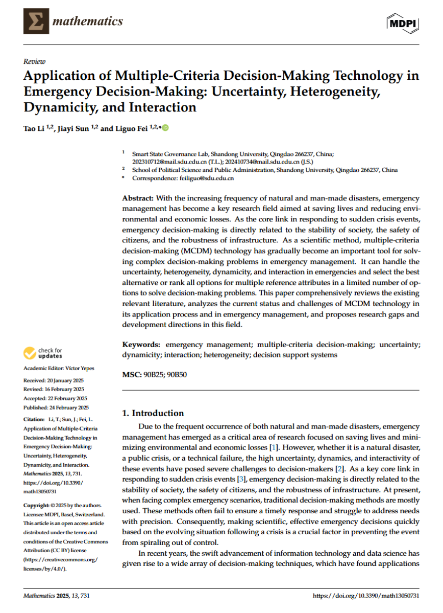 近日,山东大学智慧国家治理实验室费立国团队应SCI期刊《Mathematics》专刊邀请,发表了题为《Application of Multiple-Criteria Decision-Making Technology in Emergency Decision-Making: Uncertainty, Heterogeneity, Dynamicity, and Interaction》的论文。研究探讨了多标准决策方法(MCDM)在应急管理中的应用,特别是在应对不确定性、动态变化和多方参与挑战时的优势。