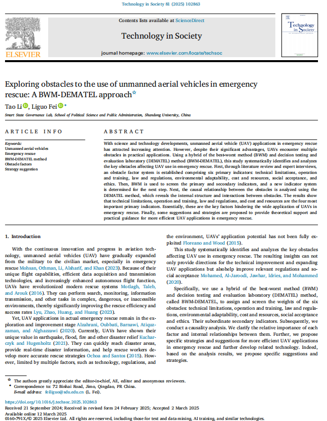 近日,山东大学智慧国家治理实验室费立国副研究员团队在SSCI中科院一区TOP期刊《Technology in Society》上发表了题为《Exploring obstacles to the use of unmanned aerial vehicles in emergency rescue: A BWM-DEMATEL approach》的论文,该期刊的最新影响因子为10.1。研究探讨了BWM‐DEMATEL方法在无人机应急救援中的应用,特别是在揭示多重障碍因素间因果关系以及应对技术局限、操作培训、法规约束与成本资源等挑战时的优势。论文构建了涵盖技术限制、操作与培训、法律法规、环境适应性、成本与资源以及社会接受与伦理等维度的障碍指标体系,通过BWM方法筛选关键指标,再利用DEMATEL方法解析各因素间的相互作用,明确了技术限制、操作培训、法律法规和成本资源为无人机在应急救援中应用的核心障碍。该研究为无人机应急救援提供了新的理论框架和决策支持,同时为未来技术改进与政策制定指明了方向。足球比分90-即时比分90