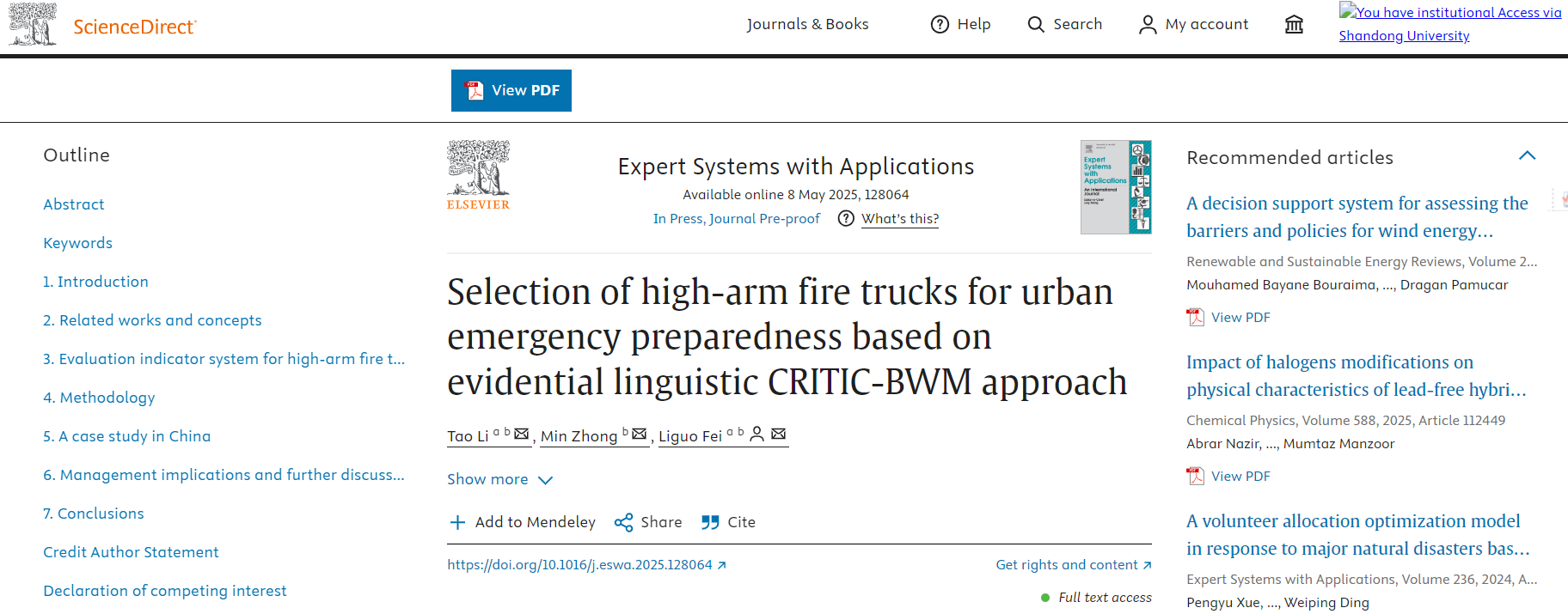 一区TOP期刊《Expert Systems with Applications》上发表题为《Selection of high-arm fire trucks for urban emergency preparedness based on evidential linguistic CRITIC-BWM approach》的研究论文。费立国研究员为该论文的通讯作者。