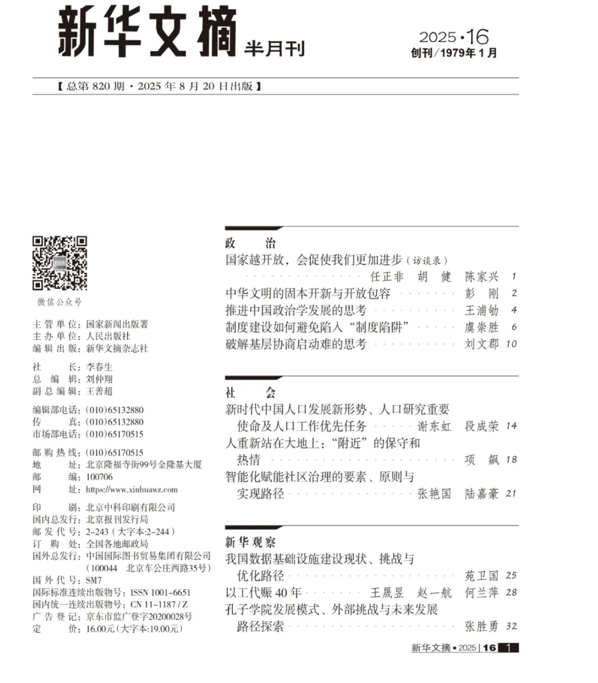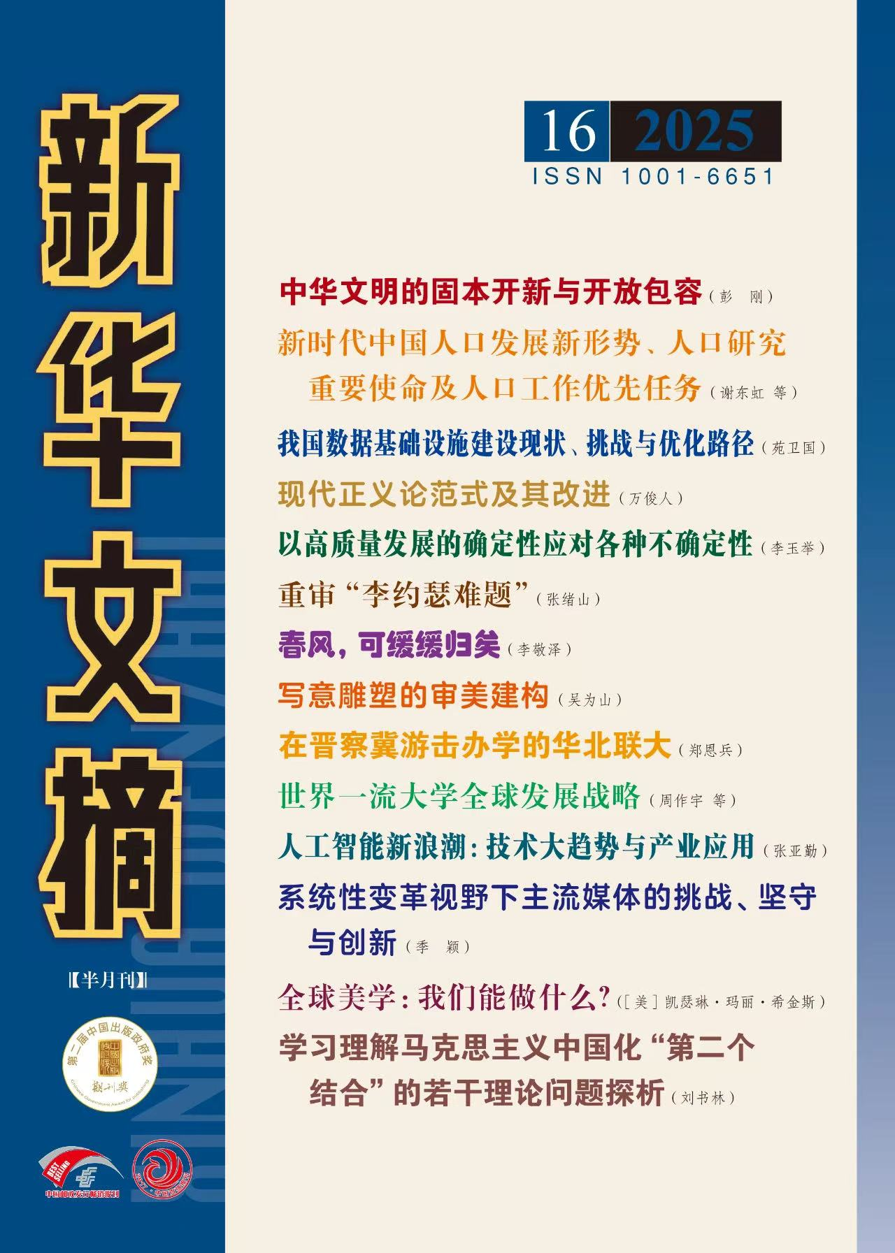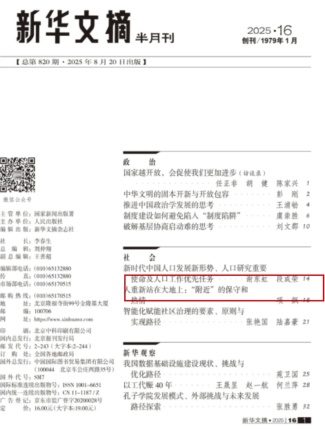 近日,足球比分90 谢东虹助理研究员发表于《人口研究》2025年第2期的《新时代中国人口发展新形势、人口研究重要使命及人口工作优先任务》一文被《新华文摘》2025年第16期作为封面文章全文转载。