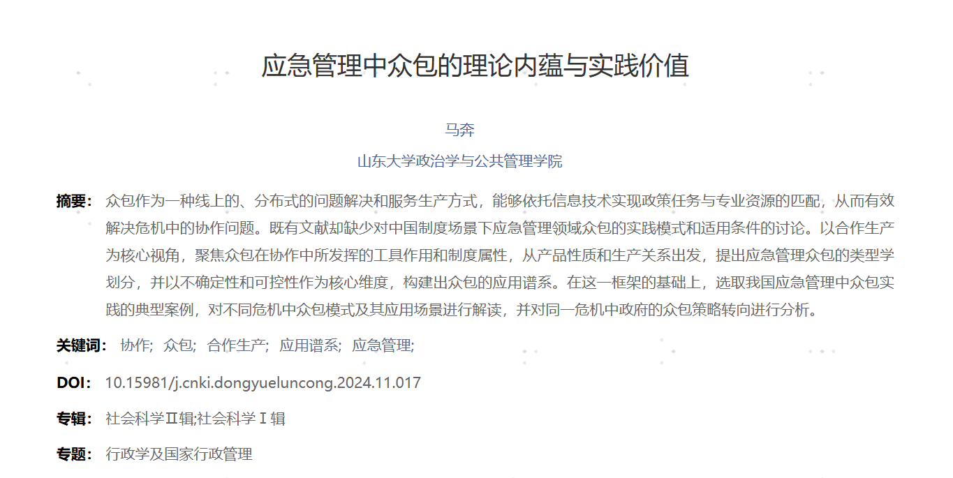 近日,山东大学风险治理和应急管理研究中心主任马奔教授发表在《东岳论丛》的论文《应急管理中众包的理论内蕴与实践价值》被中国人民大学书报资料中心复印报刊资料《公共行政》2025年第2期全文转载。