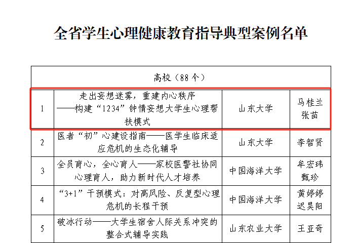 马桂兰、张苗报送的《走出妄想迷雾,重建内心秩序——构建“1234”钟情妄想大学生心理帮扶模式》成功入选“山东省学生心理健康教育指导典型案例”。