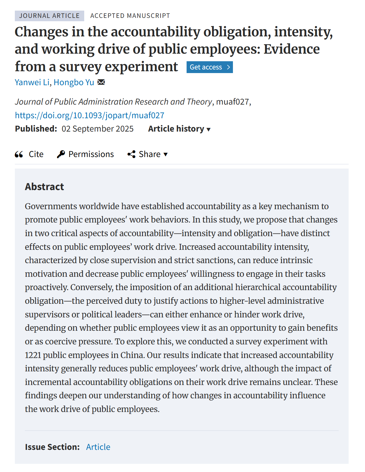 李延伟教授作为第一作者在公共管理顶级期刊Journal of Public Administration Research and Theory(JPART)在线发表题为《Changes in the accountability obligation, intensity, and working drive of public employees: Evidence from a survey experiment》的学术论文。