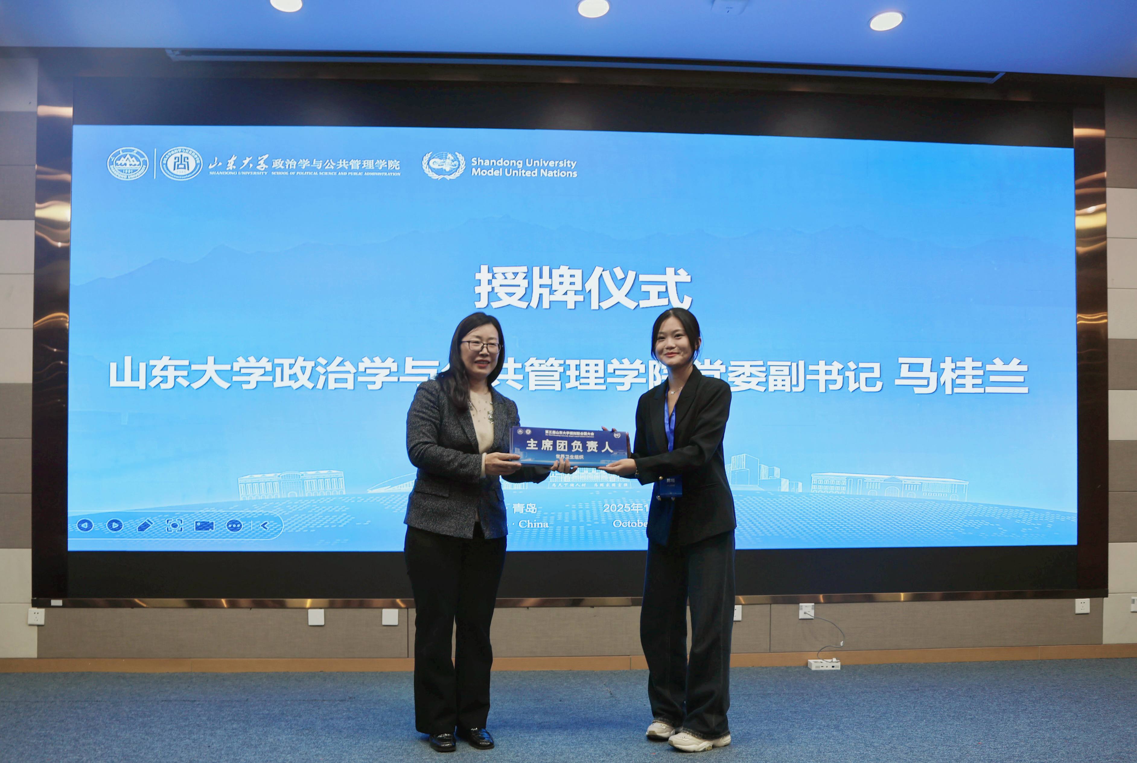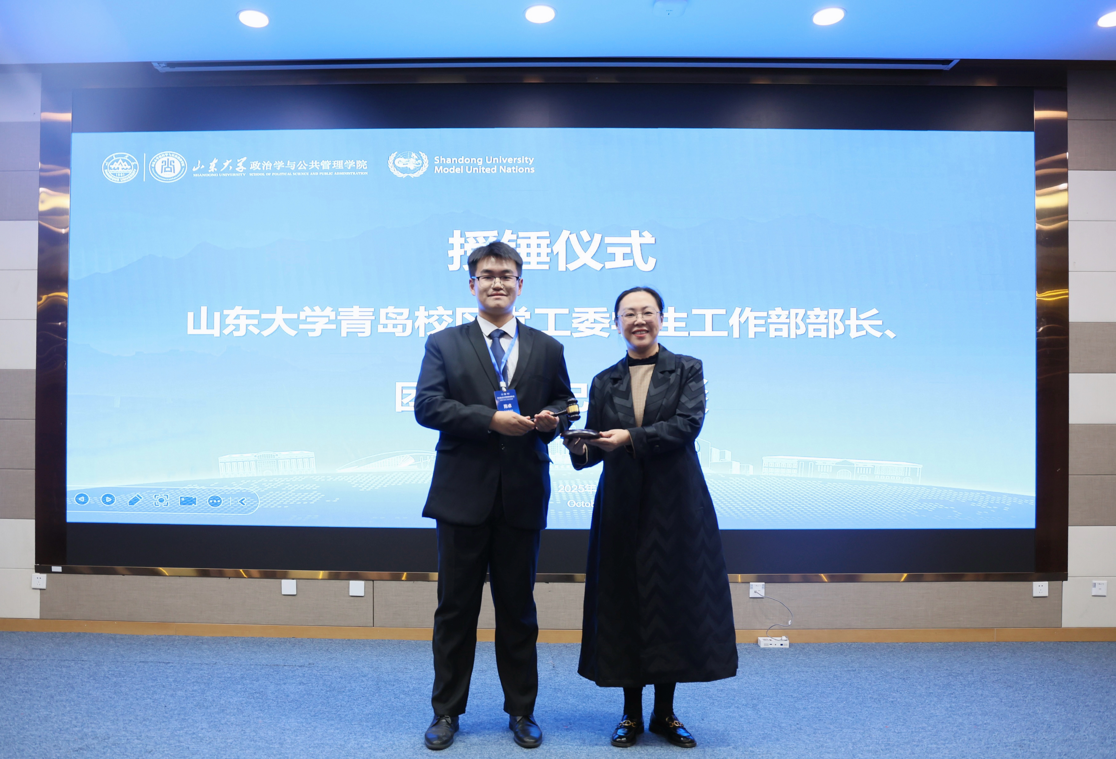 刘琰向第十三届山东大学模拟联合国大会秘书长授锤,标志着大会正式拉开帷幕。