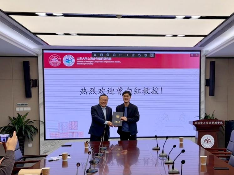 党委书记李海燕为曾向红教授颁发山东大学上海合作组织研究院高级研究员聘书。