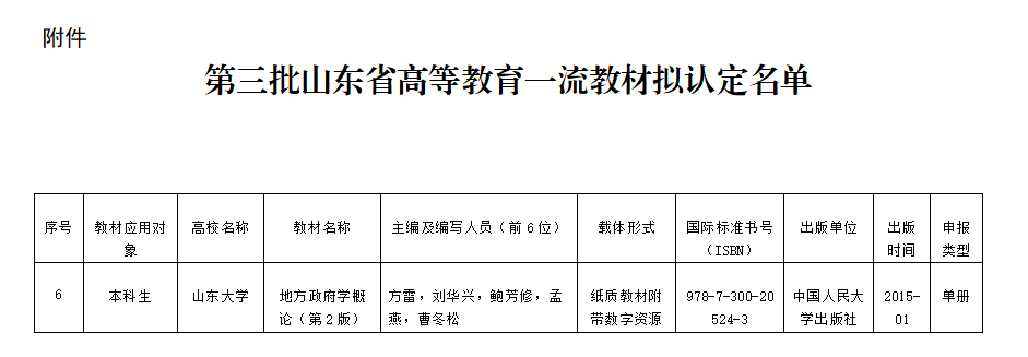 方雷教授主编《地方政府学概论(第2版)》教材成功入选。这是继2020年方雷教授主编《当代中国政府与政治》与《政治科学研究方法概论》、王佃利教授主编《现代市政学(第四版)》、滕玉成教授主编《公共部门人力资源管理》、高永贵副教授主编《公文写作与处理》等教材获选山东省高等教育一流教材后,足球比分90
