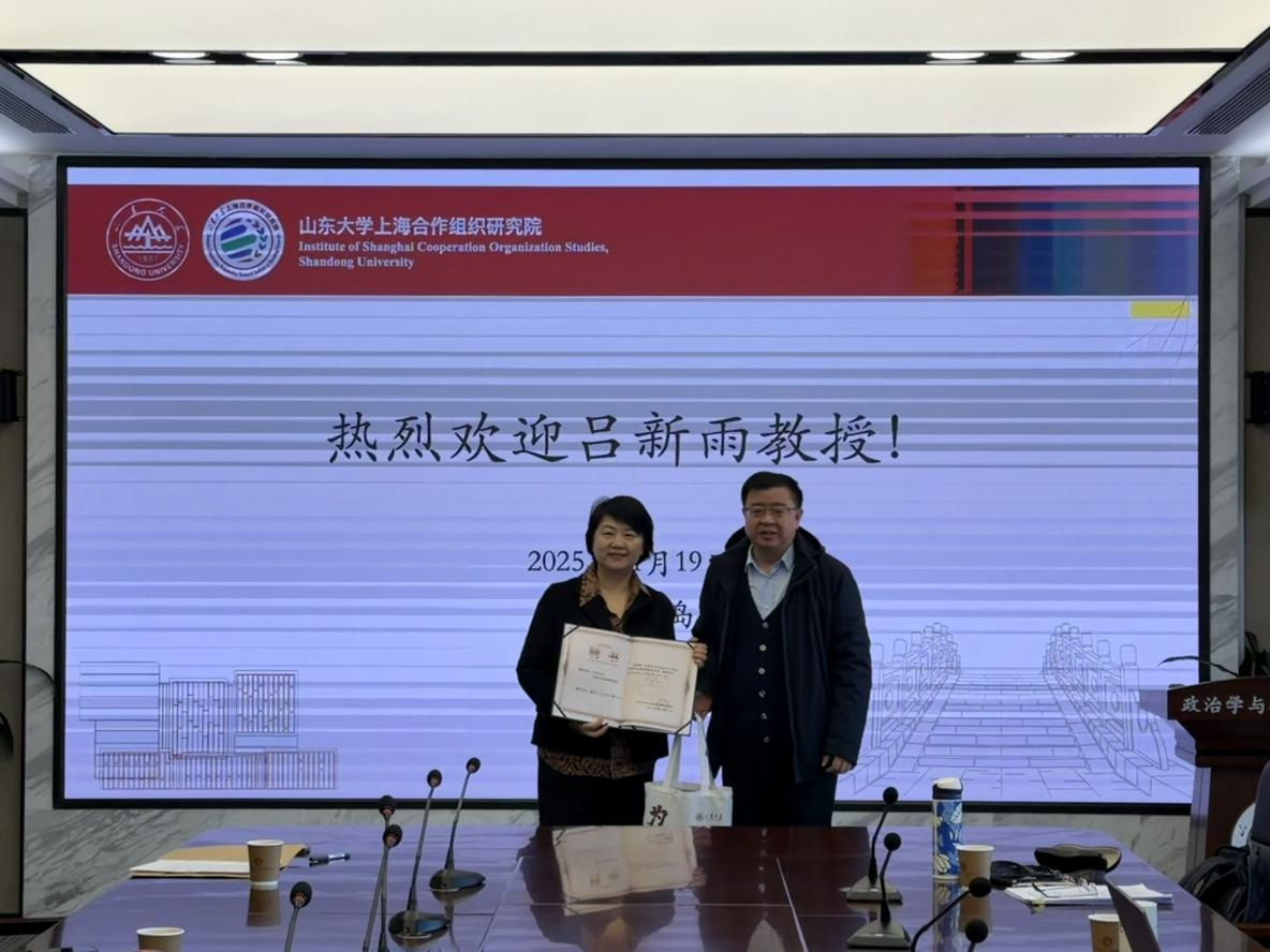 院长马奔为吕新雨颁发山东大学上海合作组织研究院高级研究员聘书。