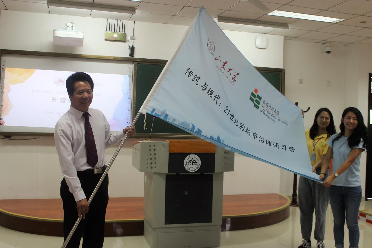 开营式首先由曹现强教授致辞,他从历史与空间、文化与内涵、传统与现代三方面对山东大学及山东大学青岛校区作了全面的介绍,并借助青岛与香港两座城市的特色阐释了此次研习营的重要意义。之后,香港教育大学和经纬副教授发表致辞,在表示感谢的同时充分肯定了研习营作为两地青年交流的平台和学校联谊平台的重要作用,祝愿两地学生在此次研习营过程中能够充分交流,收获友情。紧接着,两校代表从曹现强教授手中郑重地接过具有学术交流象征意义的研习营旗帜,授旗仪式结束后,此次研习营正式开始。