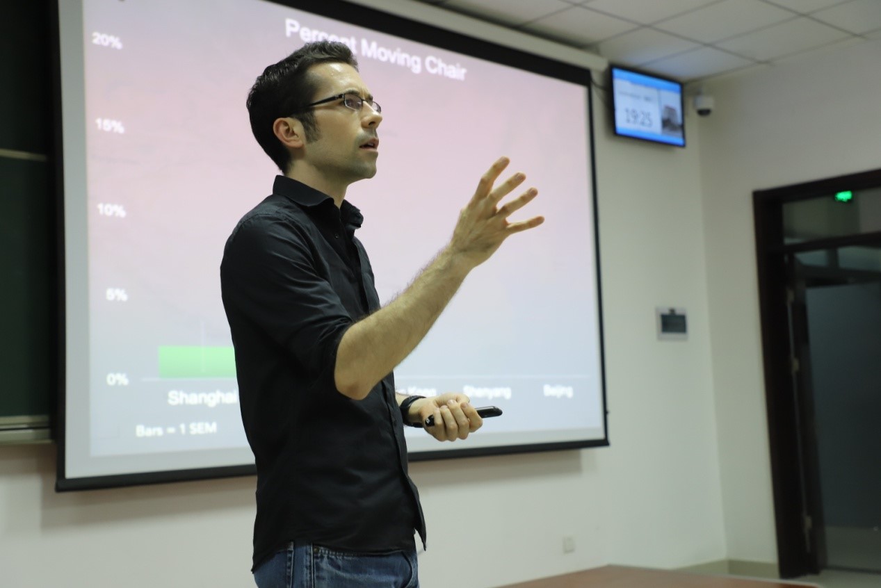 随即,Thomas教授向听众阐明了水稻种植影响文化的作用机制,以及在思维方式、思考习惯、离婚率等方面两种粮食作物对文化产生的不同影响。为验证这一研究观点,Thomas找到南北地区共有的公共场所——星巴克咖啡厅作为实验和观察场地,以测试对象是否独坐、是否挪动阻拦道路的椅子、是否过多占用公共空间为测量标准,对南北多个城市的星巴克咖啡厅的顾客进行了实验,发现南方地区的顾客更加倾向于集体主义。