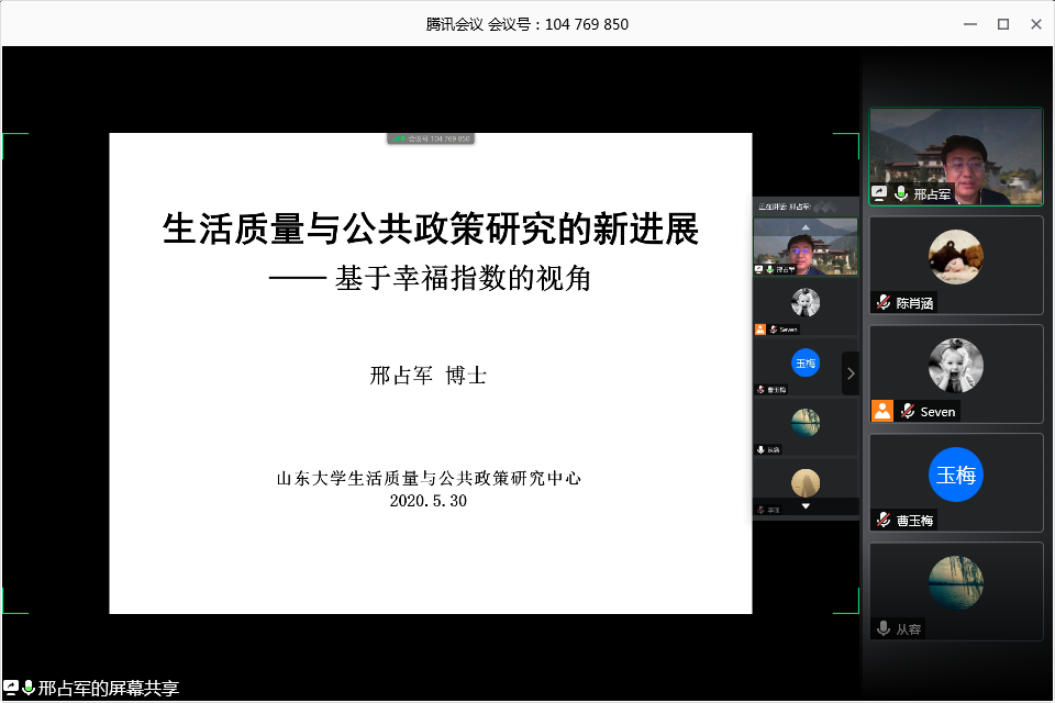 5月30日下午,山东大学生活质量与公共政策研究中心通过在线形式举办了“生活质量与公共政策研究的新进展”学术沙龙。邢占军教授首先做了专题讲座,随后同学们围绕主题进行了交流和分享。中心部分博士和硕士研究生参加了活动。