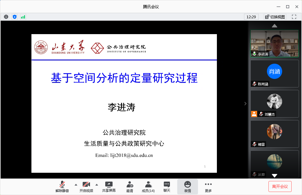 6月20日下午,山东大学生活质量与公共政策研究中心通过在线形式举办了第二期学术沙龙,主题为“基于空间分析的定量研究过程”,中心专任研究员李进涛做了专题讲座,同学们围绕主题进行了交流和分享。中心专任研究员褚雷主持此次活动。部分博士和硕士研究生参加了活动。