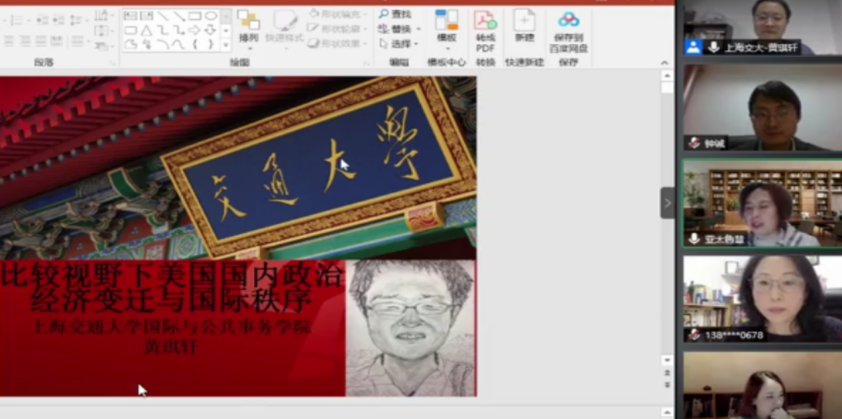 随后,讲座进入评议交流环节,各位老师围绕美国国内政治经济变迁与国际秩序的关系这一议题展开讨论。赵玙佳老师首先肯定了黄琪轩教授的研究对我们理解美国国内政治对国际秩序影响的积极意义,继而她提问道:如何从全球经济一体化的角度理解美国国内资本与产业间松散的结合关系?洪静老师也对黄琪轩教授的研究表示了肯定,她提出在当前的国际局势下,2020年美国大选仍然值得我们做进一步的深层思考;此外,她还指出,因为在哑铃型社会结构下缺乏一定的社会稳定性,未来美国的民主政治将会面临更多的挑战。