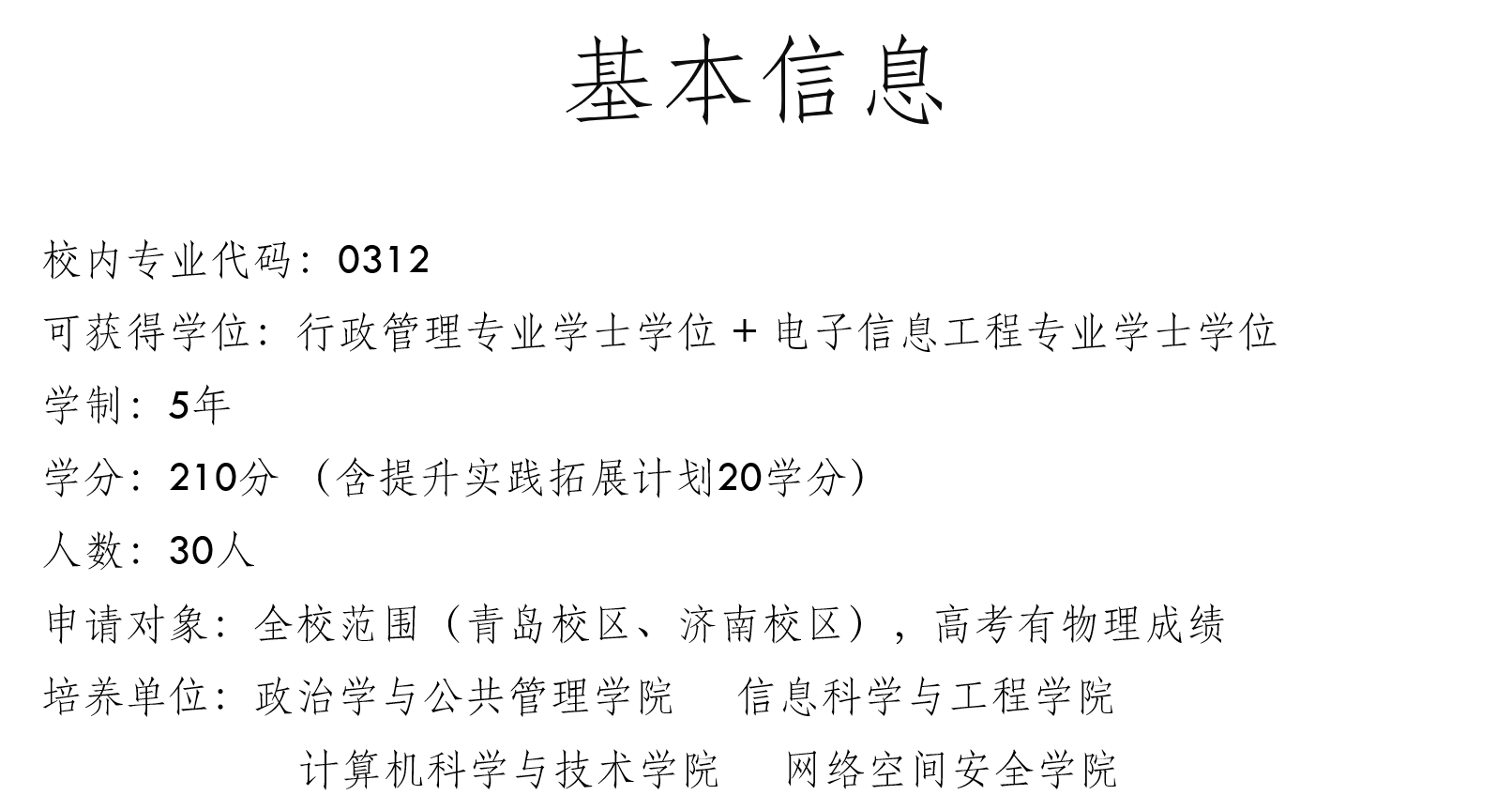 (1)深化“文工”交叉,培养高端复合型人才。公共管理学科以公共组织与公共政策为主要研究对象,致力于通过对集体行动的有效安排,实现社会公共利益的增进。信息科学则通过对各类信息技术的研究、设计、制造、应用和开发,推动社会的全面进步。将公共管理与信息科学这两大学科交叉融合,顺应国家治理和经济发展的数字化转型趋势,充分发挥山东大学综合性大学的学科优势和丰富的社会资源,培养既精通信息技术又具备管理能力的高层次人才,以满足政府部门和事业单位在数字化转型时代对复合型人才的需求。